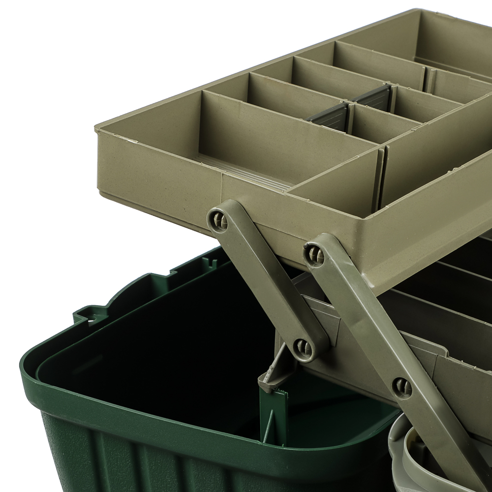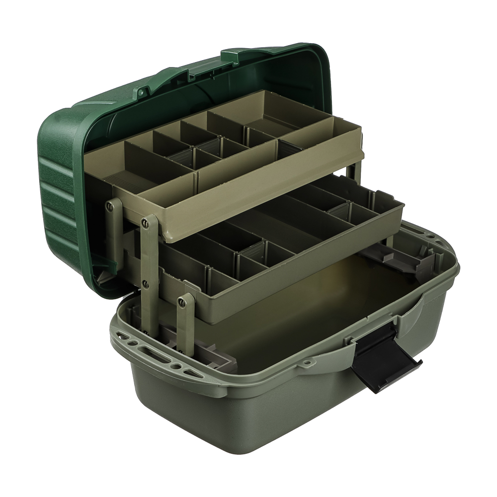 Ящик рыболова двухполочный от AZOR FISHING размером 33x20,5x16 см изготовлен из прочного и ударопрочного полипропилена. Зеленый цвет ящика органично сочетается с окружающей средой, что делает его идеальным выбором для любителей рыбалки. Этот ящик имеет две полки, которые обеспечивают дополнительное пространство для хранения рыболовных принадлежностей, таких как крючки, приманки, лески и другие необходимые аксессуары. Каждая полка оснащена удобными перегородками, которые позволяют организовать хранение различных предметов рыболовного снаряжения. Полки открываются автоматически вместе с крышкой, которая создает дополнительный упор. Верхний отсек – с регулируемыми ячейками, в нижнем - ячейки фиксированного размера.Ящик рыболова двухполочный изготовлен из качественных материалов, которые обеспечивают его долговечность и стойкость к внешним воздействиям. Он также имеет крышку с замком, которая обеспечивает безопасность и защиту содержимого ящика от пыли и воды. Ящик рыболова AZOR FISHIN
