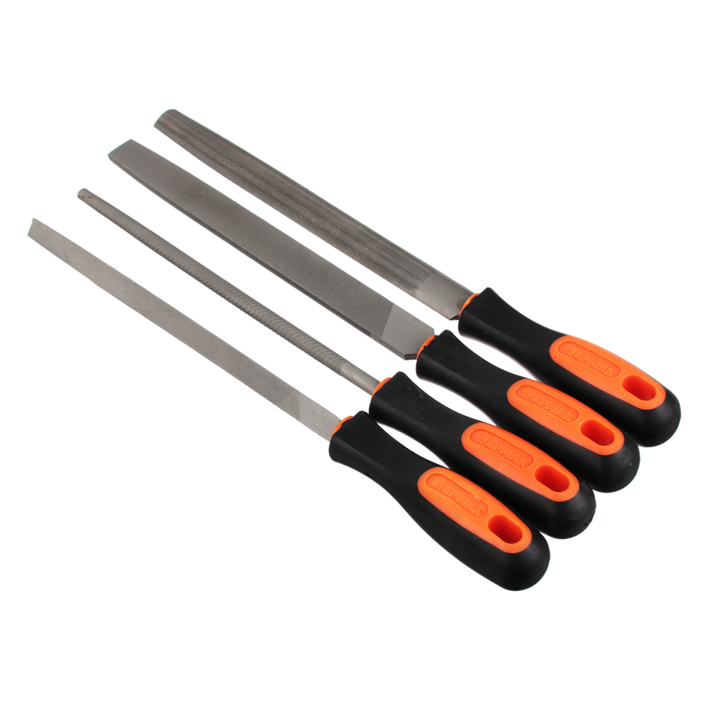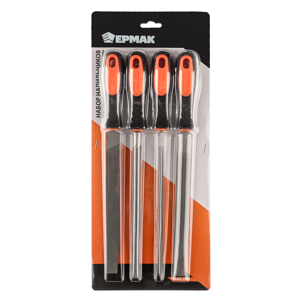 Набор напильников ЕРМАК 200 мм – это комплект из четырех инструментов с круглым, полукруглым, трехгранным и плоским сечениями. Инструменты выполнены из высококачественной прочной износостойкой стали, устойчивой к истиранию, а рукоятки состоят из двухкомпонентного материала, который обеспечивает надежный хват и не выскальзывает из рук в процессе работы. Подходят для бытового и профессионального использования.