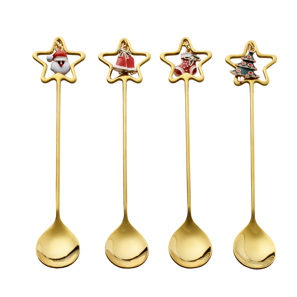 Набор из четырёх чайных ложек с новогодним дизайном, выполненных из высококачественной нержавеющей стали с золотистым покрытием, станет ярким и праздничным аксессуаром для вашего стола. Каждая ложка имеет элегантную длинную ручку, оформленную в виде звезды, внутри которой размещена миниатюрная новогодняя фигурка. Благодаря прочному материалу и стильному исполнению, ложки не только практичны, но и служат оригинальным украшением для чаепития в праздничные дни. Легко моются, устойчивы к коррозии и идеально подходят для повседневного использования или как подарок. С таким набором каждый глоток чая или кофе станет настоящим праздником!