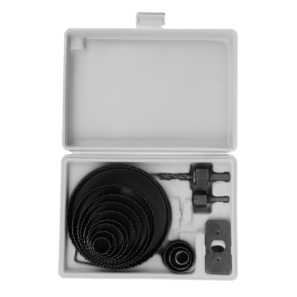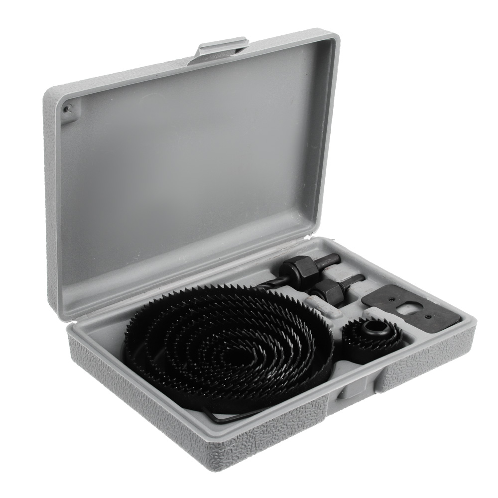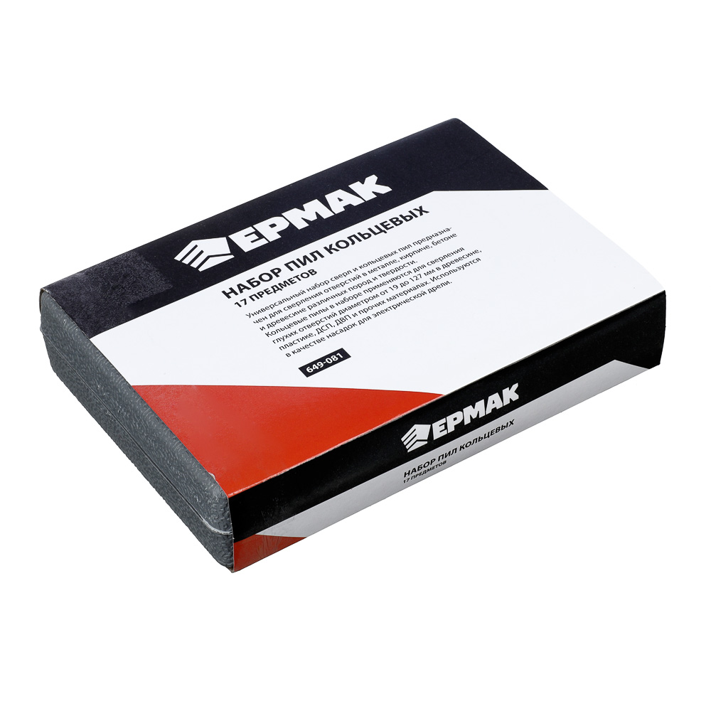 Набор кольцевых пил ЕРМАК из 17 предметов предназначен для высверливания круглых отверстий в древесине различных пород и твердости, гипсокартоне, фанере, ДСП, металле, кирпиче, бетоне и прочих материалах. Используется совместно с дрелями. Диаметр отверстий от 19 до 127 мм. В набор также включены сверла, шестигранный ключ, адаптер для кольцевых пил диаметром свыше 44 мм. Набор поставляется в пластиковом кейсе.
