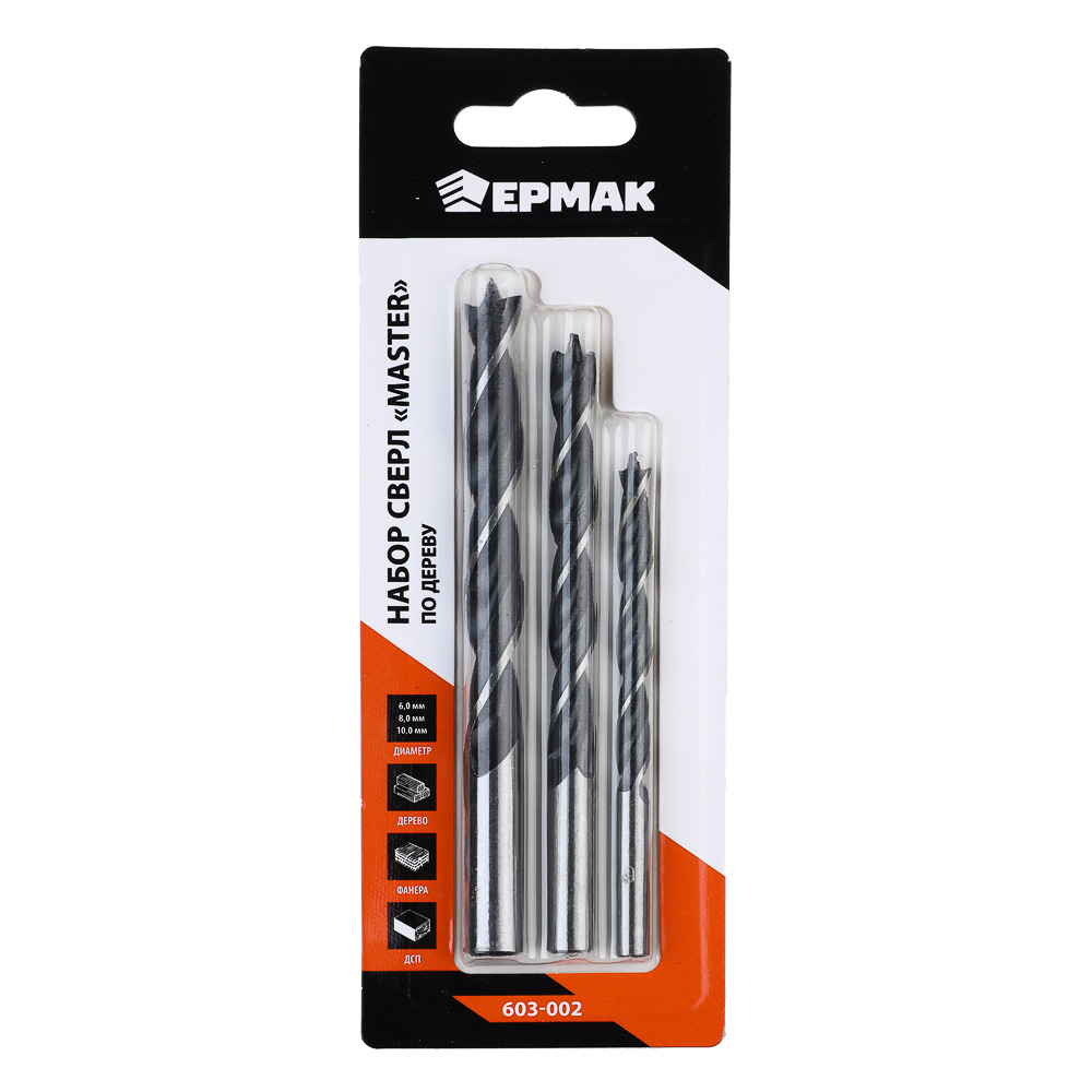Набор сверл по дереву ЕРМАК с М-образной заточкой, серии MASTER (3 шт. 6, 8, 10 мм). Применяется для выполнения глухих и сквозных отверстий в различных породах древесины, а также в клеевых и фанерных щитах. Сверла с М-образной заточкой в форме трезубца и подражателями обеспечивают моментальное выполнение отверстия и удобство в работе. Изготовлены из углеродистой стали. Твердость режущих кромок — 40 HRC.