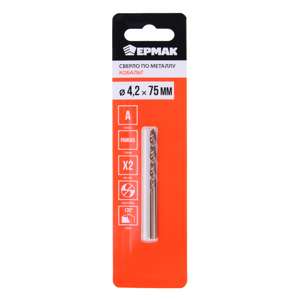 Сверло по металлу ЕРМАК «Кобальт» 4.2х75 мм класса А – это высококачественная оснастка для электроинструмента из стали Р6М5К5. Сверло не ломается, не деформируется, не крошится, не боится воздействия высоких температур, быстро и качественно работает по различным металлам и сплавам. Имеет долгий ресурс службы. Угол заточки 135 градусов означает, что сверло отлично справляется нержавеющей сталью.