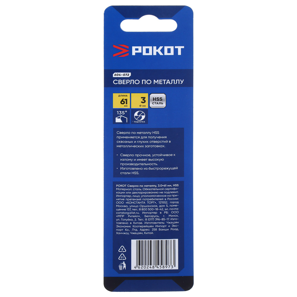 Сверло РОКОТ идеально подходит для использования в быту и профессиональной сфере. Оно обеспечивает быстрое и точное сверление, а также долгий срок службы благодаря своей прочности и устойчивости к износу. Сверло имеет цилиндрический хвостовик, что гарантирует надёжное крепление в патроне инструмента. Угол заточки 135 градусов позволяет сверлить отверстия с высокой точностью и аккуратностью. Изготовленное из высококачественной стали, сверло обладает прочностью и стойкостью к коррозии, что делает его идеальным выбором для работы с различными видами металлов и сплавов. Диаметр сверла — 3 мм, длина — 61 мм.