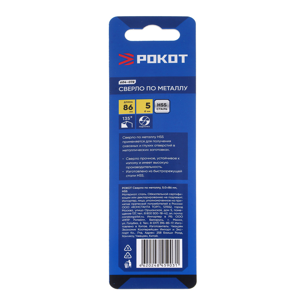 Сверло РОКОТ идеально подходит для использования в быту и профессиональной сфере. Оно обеспечивает быстрое и точное сверление, а также долгий срок службы благодаря своей прочности и устойчивости к износу. Сверло имеет цилиндрический хвостовик, что гарантирует надёжное крепление в патроне инструмента. Угол заточки 135 градусов позволяет сверлить отверстия с высокой точностью и аккуратностью. Изготовленное из высококачественной стали, сверло обладает прочностью и стойкостью к коррозии, что делает его идеальным выбором для работы с различными видами металлов и сплавов. Диаметр сверла — 5 мм, длина — 86 мм.