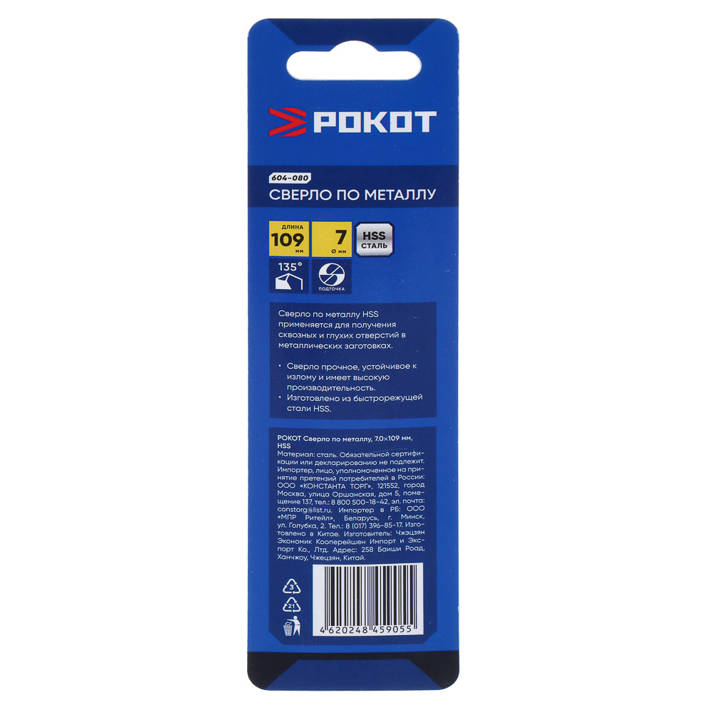 Сверло РОКОТ идеально подходит для использования в быту и профессиональной сфере. Оно обеспечивает быстрое и точное сверление, а также долгий срок службы благодаря своей прочности и устойчивости к износу. Сверло имеет цилиндрический хвостовик, что гарантирует надёжное крепление в патроне инструмента. Угол заточки 135 градусов позволяет сверлить отверстия с высокой точностью и аккуратностью. Изготовленное из высококачественной стали, сверло обладает прочностью и стойкостью к коррозии, что делает его идеальным выбором для работы с различными видами металлов и сплавов. Диаметр сверла — 7 мм, длина — 109 мм.