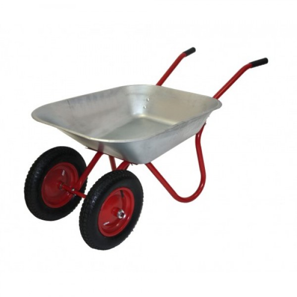 Тачка садовая оборудована двумя колесами на подшипнике качения, гарантирующим легкий ход при максимальной нагрузке и высокую работоспособность. Корыто имеет повышенную глубину, оцинковано, имеет бортовой контур жесткости по периметру в виде отогнутого края. Профиль корыта приспособлен для работы с сыпучими и мелкоштучными материалами – песком, щебнем, булыжником, кирпичом. Эта тачка приспособлена к разгрузке опрокидыванием.