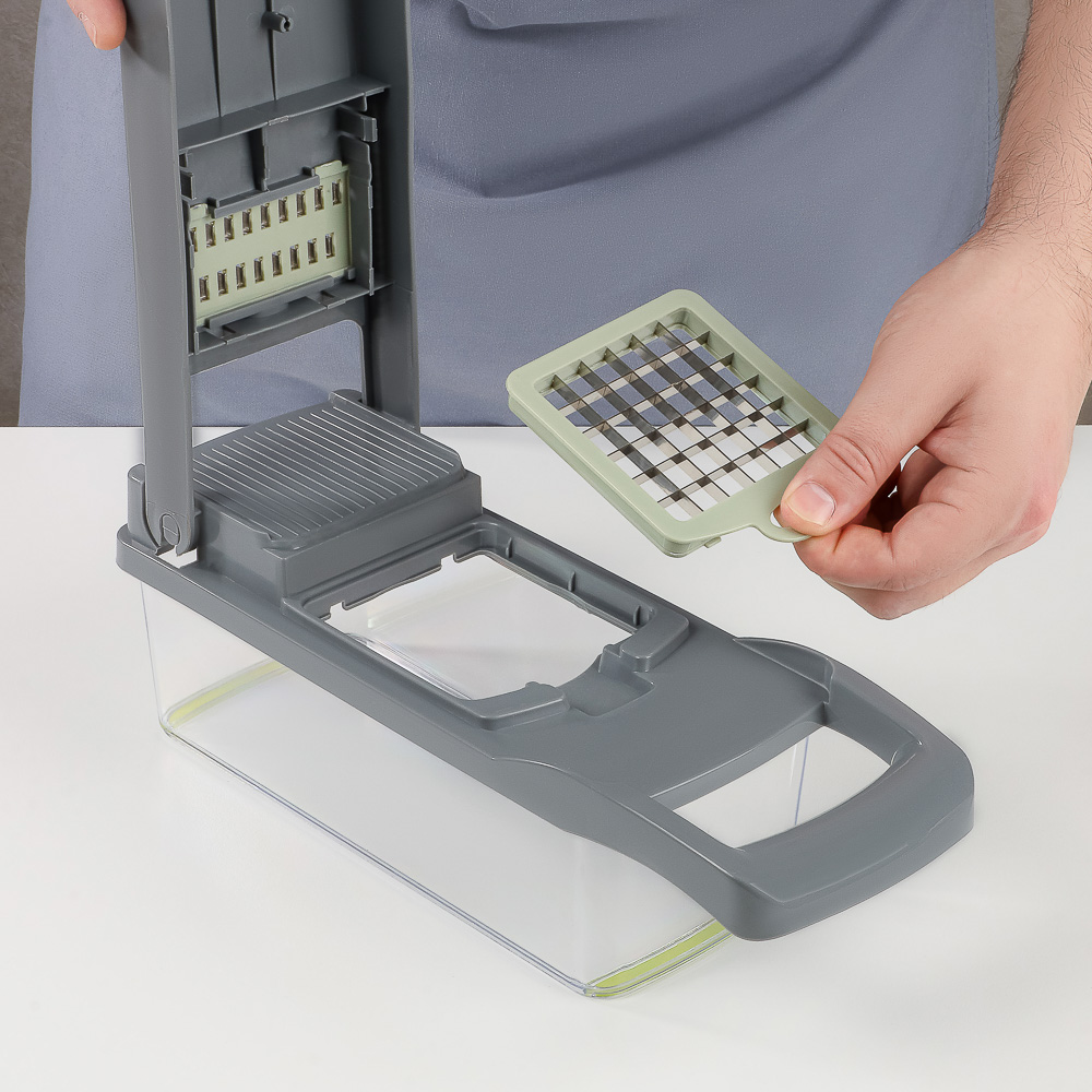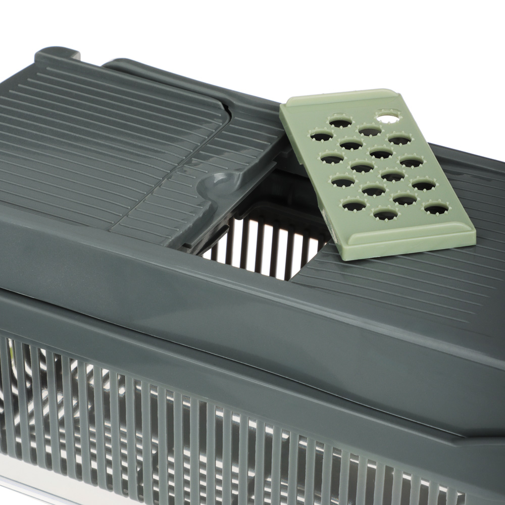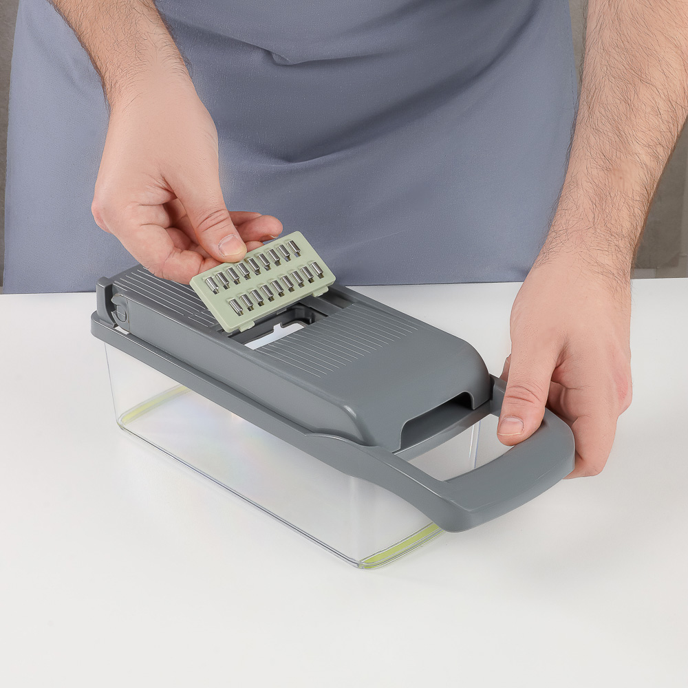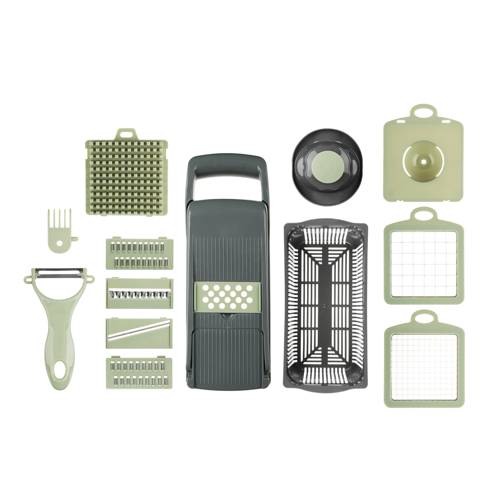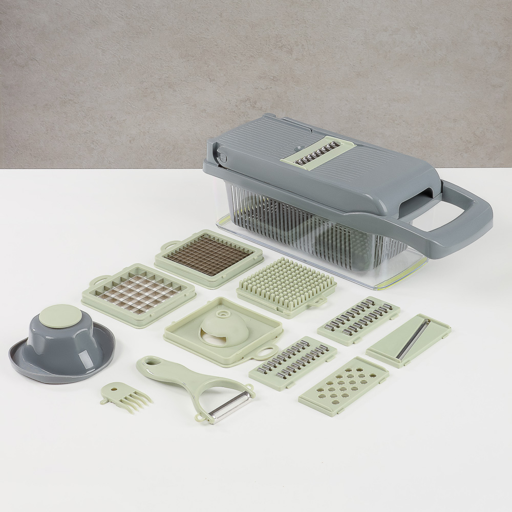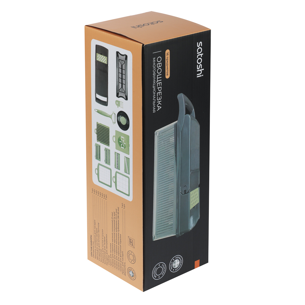 Овощерезка многофункциональная SATOSHI из 16 предметов "Мастер Слайсер" – это профессиональный кухонный помощник для идеальной нарезки овощей, фруктов и других продуктов. В комплекте 16 сменных насадок для различных видов шинковки, нарезки соломкой, кубиками и слайсами. Овощерезка значительно ускорит процесс приготовления любых блюд: супов, салатов и свежих и отварных овощей, вторых блюд, заготовок для заморозки. Набор также включает овощечистку, емкость с отверстиями для отделения жидкой фракции и пресс-ручка, которая защищает пальцы от повреждений. Корпус овощерезки и насадок изготовлен из прочного пищевого пластика, а металлические части и лезвия – из нержавеющей стали, устойчивой к коррозии и деформации. Все детали легко моются.