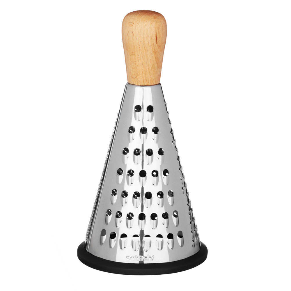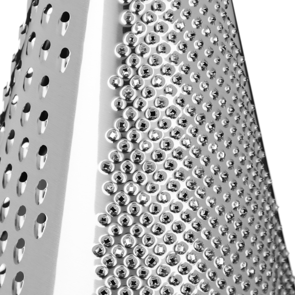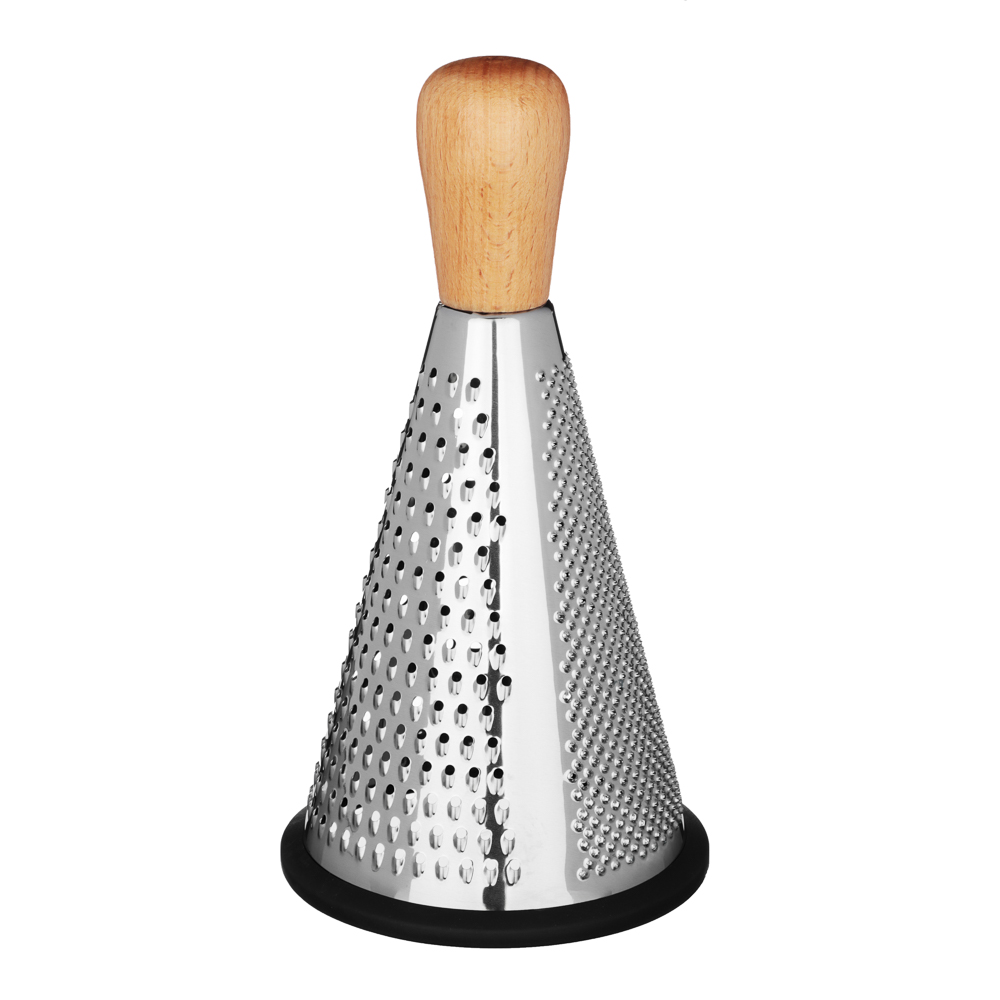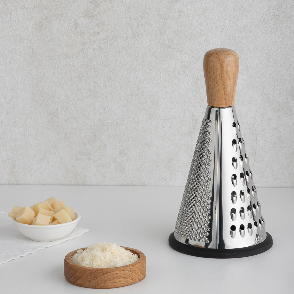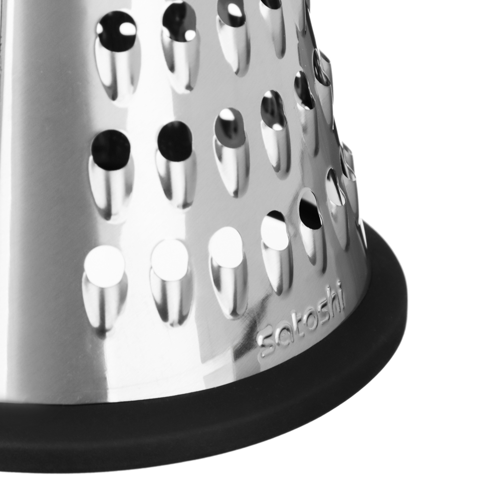 Тёрка – необходимый кухонный помощник в каждом доме! Это многофункциональный и долговечный инструмент. Многие хозяйки даже не догадываются о том, сколько всего можно приготовить, если использовать все рабочие поверхности тёрки. Крупные отверстия предназначены для овощей, сыра, яиц, шоколада и масла. По секрету, кондитеры, чтобы ускорить процесс приготовления, натирают масло на крупной тёрке. Мелкие отверстия предназначены для украшения стружкой или для измельченной нарезки. С колючей стороной тёрки нужно быть осторожным, чтобы не нанести травму. Она предназначения для измельчения чеснока, острого перца, орехов, сухарей, имбиря. А также поможет снять цедру с цитрусовых. Продолговатые отверстия предназначены для нарезки овощных и фруктовых слайсов. С помощью неё можно приготовить рататуй, домашние картофельные чипсы, луковые кольца, запеканку из кабачков и многое другое. Терка 4-х сторонняя SATOSHI имеет эргономичную деревянную ручку, которая обеспечивает оптимальный контроль над проце