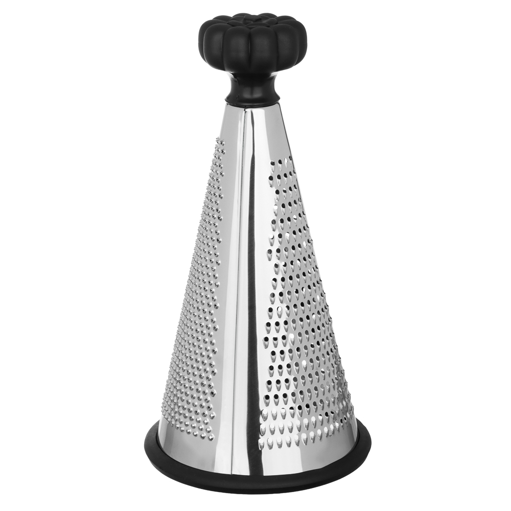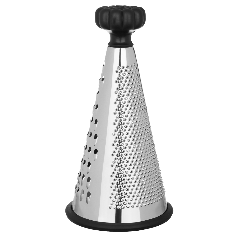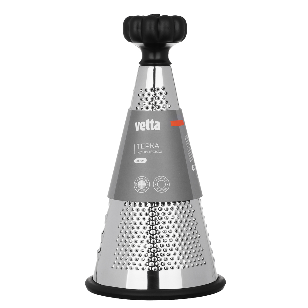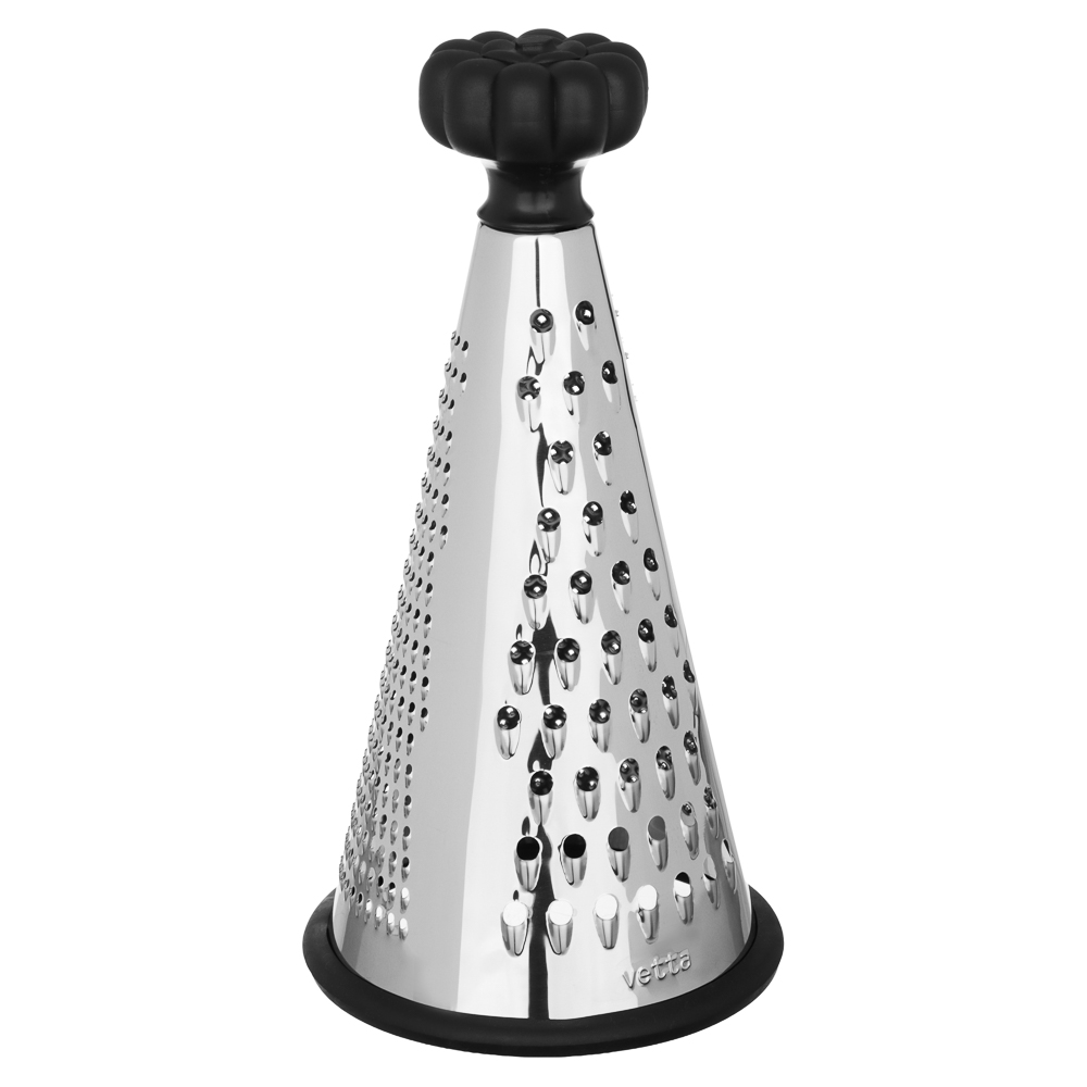 Когда нужно быстро и аккуратно натереть сыр, овощи или шоколад, коническая терка VETTA 25 см станет вашим главным помощником. Форма конуса позволяет равномерно и быстро обрабатывать продукты. Удобно держать в руке, не устаёт запястье даже при длительной работе. Вся рабочая поверхность выполнена из нержавеющей стали, заточена точно, режет чисто и без усилий. Черная эргономичная ручка приятна на ощупь, не скользит.