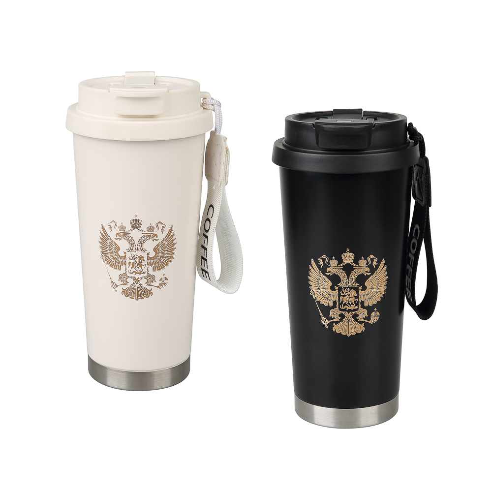 Термос-кружка «Президент» 500 мл, нержавеющая сталь 18/10 – это замечательный подарок по случаю государственного или профессионального праздника. Термос выполнен из премиальных материалов, имеет стильный строгий дизайн в черном или белом цвете с изображением государственного герба России – двуглавого орла. Двойные стенки эффективно сохраняют температуру напитка, а герметичная крышка дополнительно снижает теплопотери и исключает случайное протекание содержимого. Предусмотрен клапан для питья с откидной защелкой, что позволяет пить чай или кофе прямо на ходу или во время поездки на автомобиле. Размер термоса подходит для большинства автомобильных подстаканников. Изделие легко моется, покрытие не истирается и не царапается, а металлический корпус устойчив к повреждениям. Предусмотрен ремешок для удобной переноски в руках.