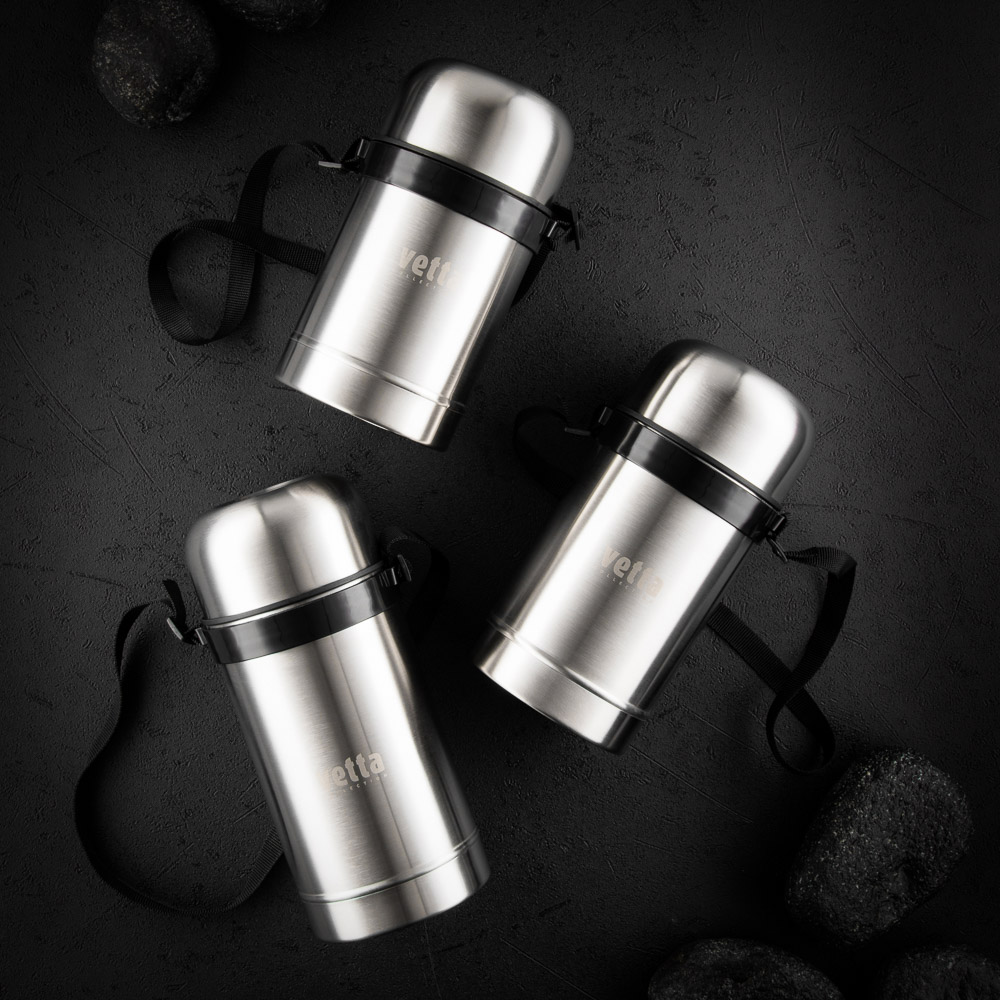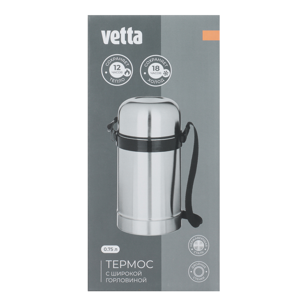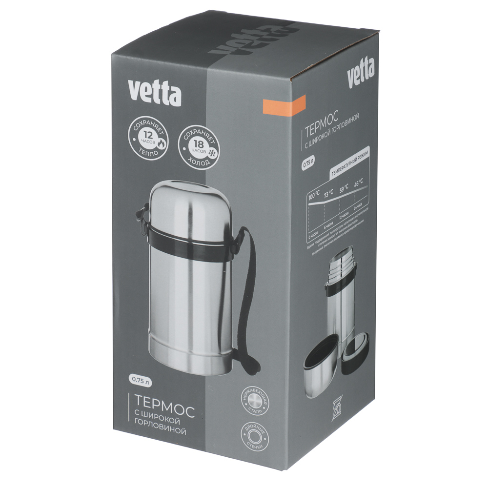 Термос VETTA для еды объемом 0,75 л широким горлом позволяет насладиться вкусным обедом посреди активного рабочего дня. В термосе вас будут ждать домашние обеды, например, запеченная картошка или мясной супчик. Аксессуар удобно брать на работу, пикник на природе и туристический поход. Надежный корпус и герметичная крышка хорошо удерживают тепло, поэтому обед сохраняет температуру долгое время.