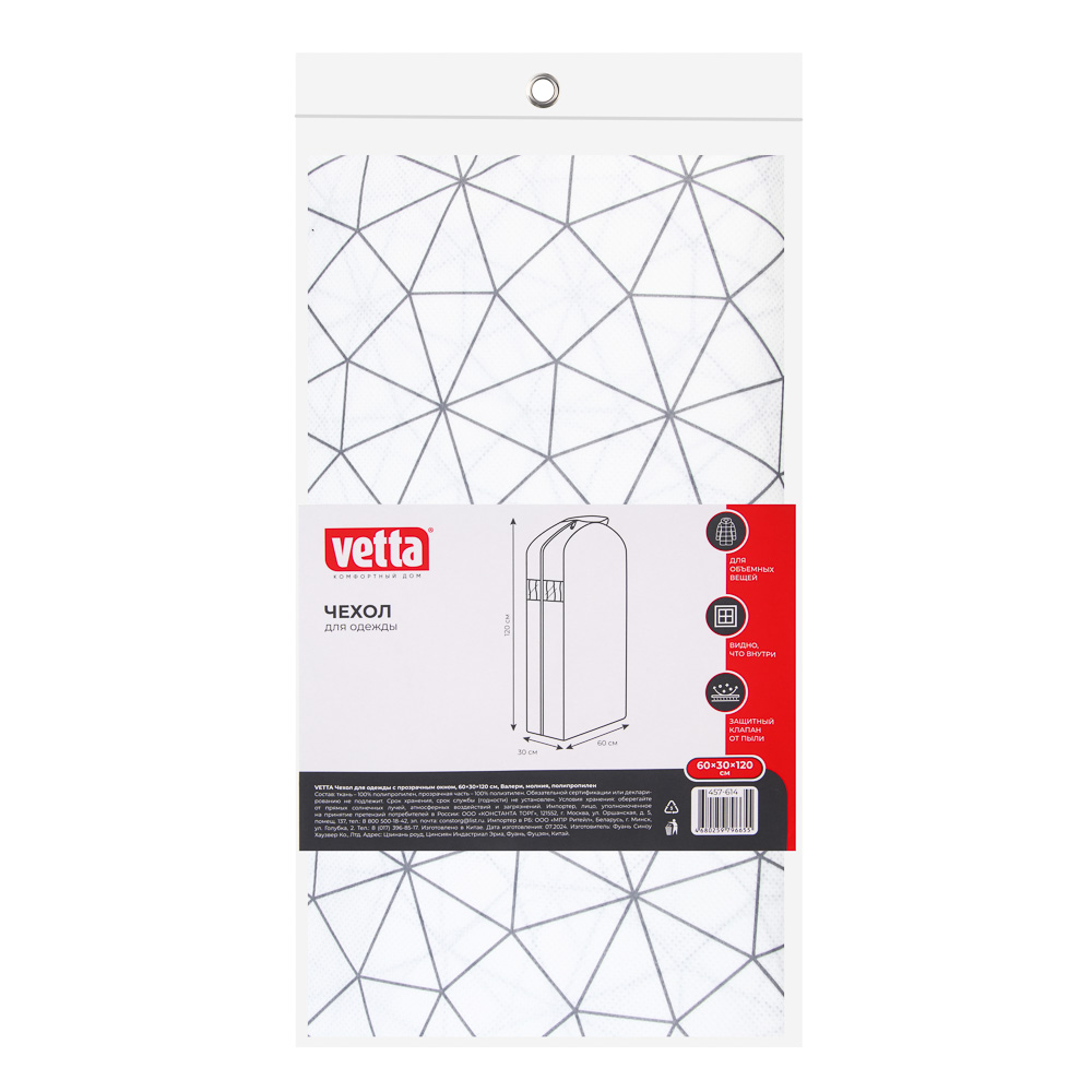 Чехол-кофр для одежды семейный VETTA "Валери" 60х30х120 см предназначен для хранения верхней одежды – курток, пальто, плащей, а также деловых костюмов и платьев. Прекрасно защищает одежду от пыли и сминания. Замок-молния по всей длине чехла обеспечивает беспрепятственный доступ к гардеробу без необходимости снятия чехла с вешалки. Прозрачное окошко позволяет быстро найти нужную вещь.