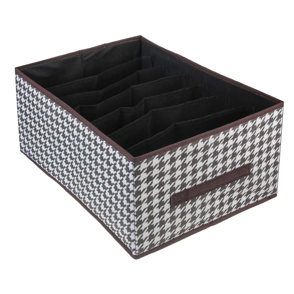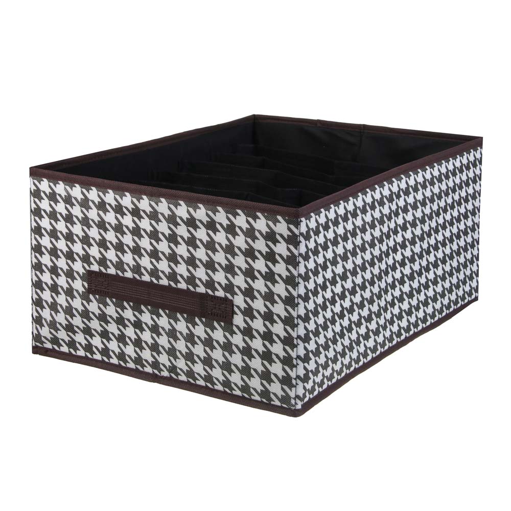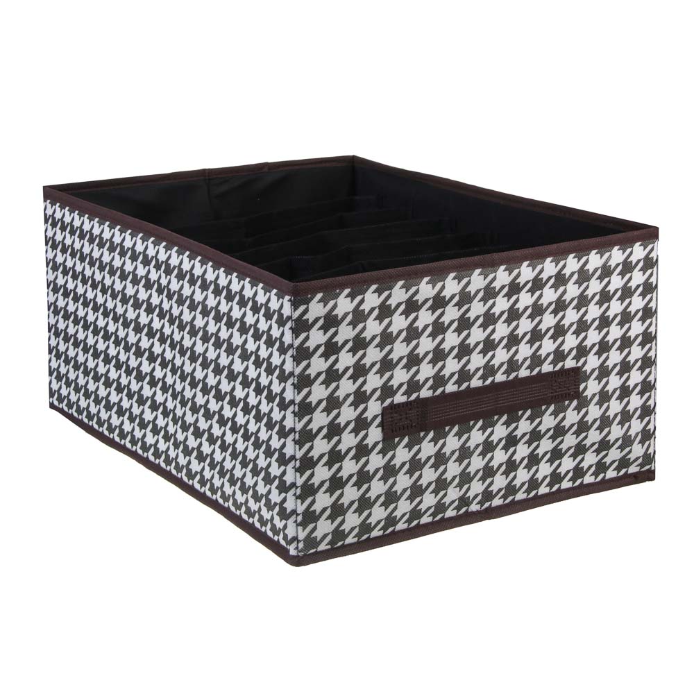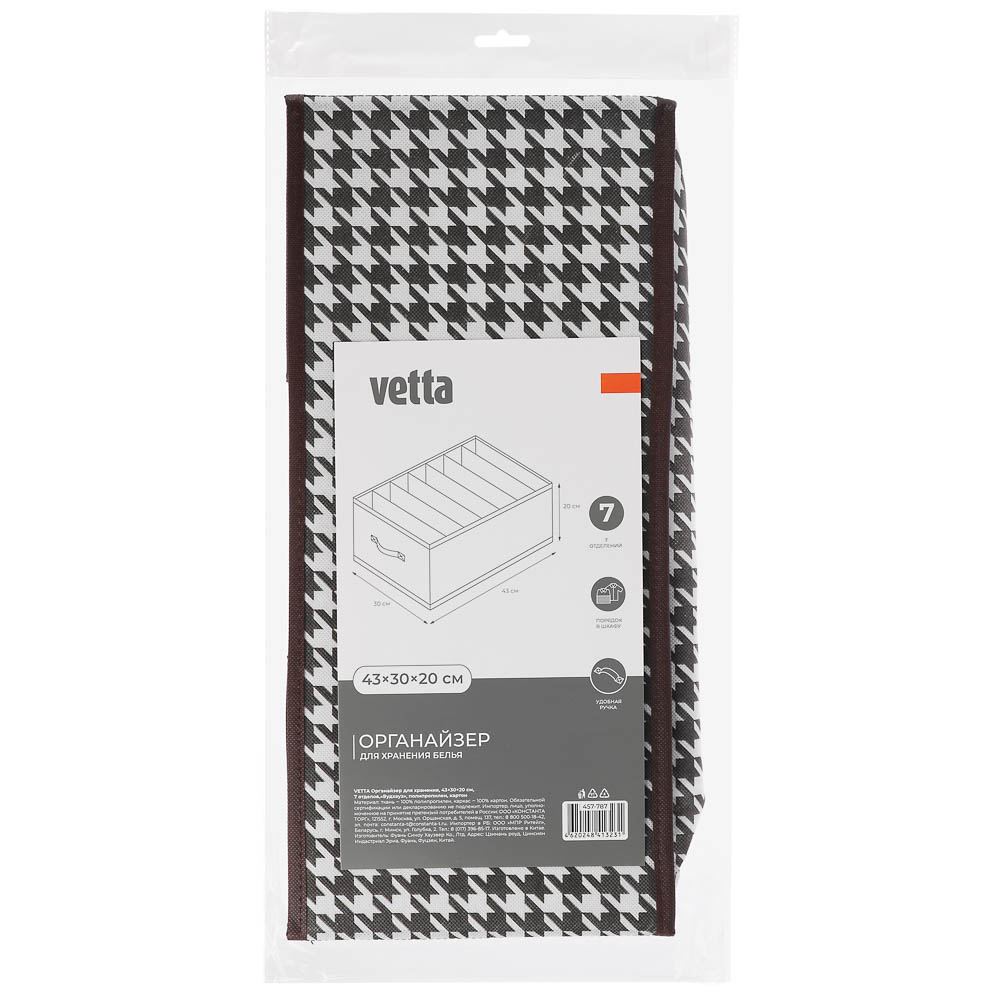 Органайзер для хранения VETTA «Вудхауз» — это стильный и функциональный аксессуар для вашего дома. Он состоит из 7 отделений и имеет размеры 43x30x20 см. Прочный полипропилен и плотный картон обеспечивают надёжность и долговечность изделия. Черно-белый дизайн с рисунком «гусиная лапка» придает органайзеру элегантный и современный вид. Этот аксессуар станет отличным решением для организации пространства и поддержания порядка в вашем доме.