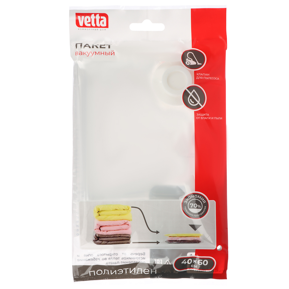 VETTA Пакет вакуумный 40x60см с клапаном представляет собой практичное решение для эффективного хранения вещей в домашних условиях. Этот компактный пакет станет незаменимым помощником в организации пространства и сезонном хранении одежды, предлагая оптимальное сочетание функциональности и удобства использования. Благодаря размеру 40x60 см пакет прекрасно подходит для хранения комплектов постельного белья, одеял, подушек и сезонной одежды. Встроенный клапан для откачки воздуха с помощью пылесоса в сочетании с надежной застежкой-молнией обеспечивает герметичность и защиту содержимого от пыли и влаги. Прочный полиэтилен гарантирует долговечность использования и эффективную защиту хранимых вещей.