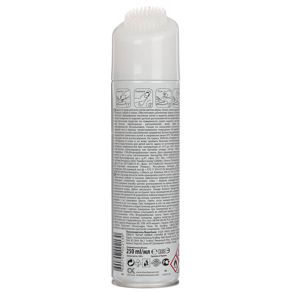 Спрей водоотталкивающий SILVER для всех типов изделий, 250 мл – универсальное средство, которое создаёт невидимый барьер, эффективно защищающий обувь, одежду, аксессуары и текстиль от влаги, грязи и неблагоприятных погодных условий. Просто распылите спрей равномерно на сухую поверхность с расстояния 15–20 см и дайте высохнуть: готово! Препарат универсален по отношению к различным материалам – натуральной и искусственной коже, текстилю и другим поверхностям. Благодаря удобному объёму и компактному формату, средство пригодится как в повседневных условиях, так и в путешествиях.