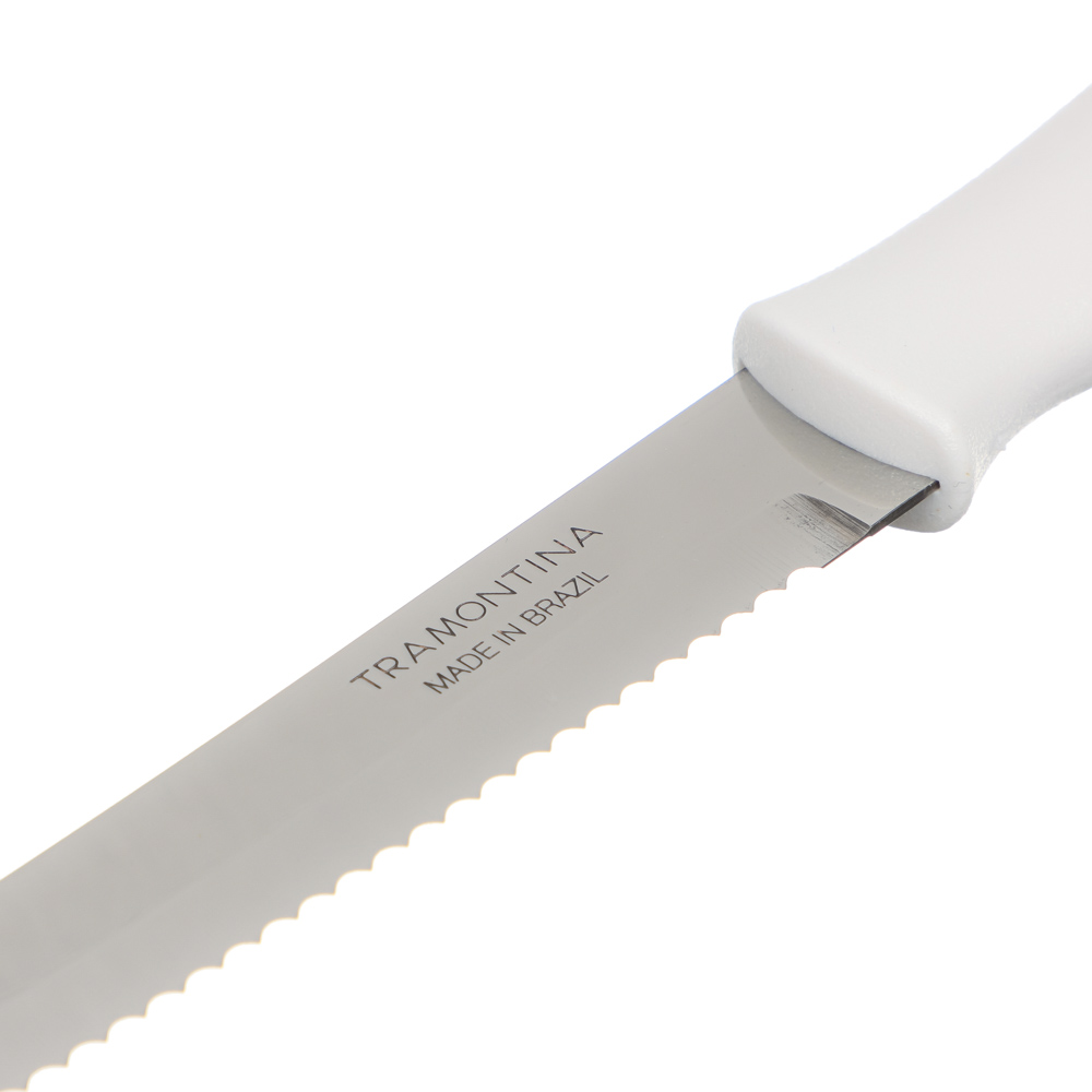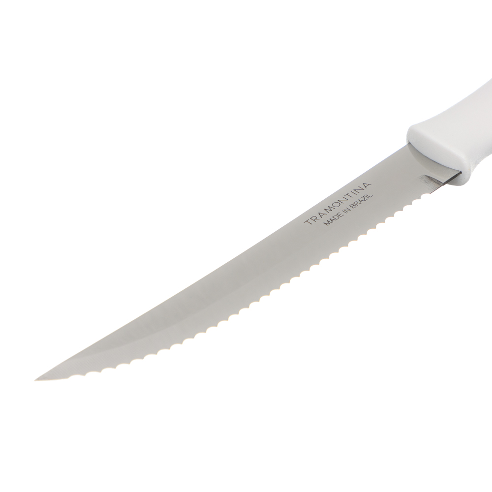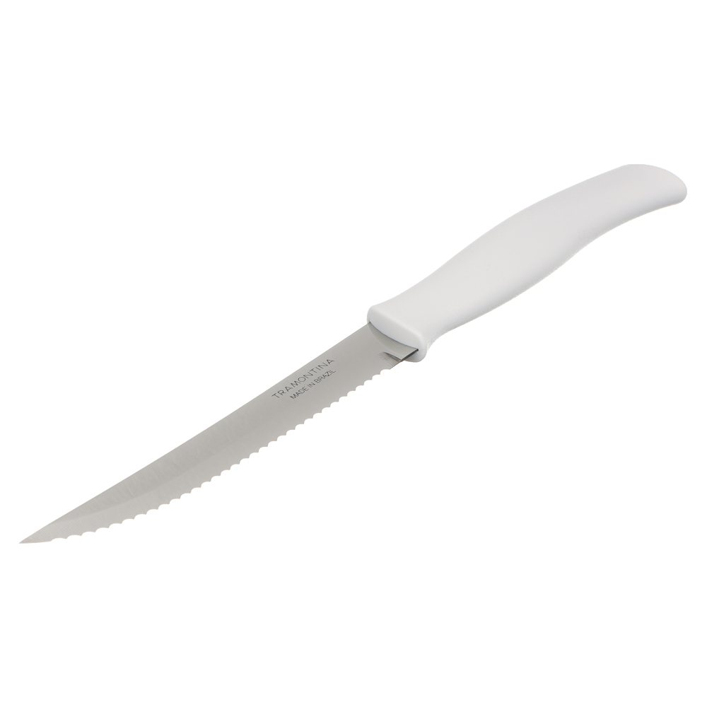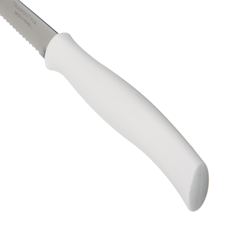 Нож для мяса Tramontina Athus получил пилообразную режущую кромку с крупными зубчиками для идеальной нарезки мясных продуктов. Нержавеющая сталь марки AISI 420 прошла термическую обработку, поэтому обладает повышенной прочностью. Не боится коррозии. Не абсорбирует запахи, предотвращает размножение бактерий. Полипропиленовая ручка не скользит. Благодаря эргономичной форме удобно ложится в руке. 5 причин купить нож для мяса Tramontina Athus:• зубчики исключают скольжение режущей кромки по гладкой поверхности мяса• делает точные аккуратные надрезы, позволяя получить красивые стейки• не ржавеет, не придает свинине и говядине металлический привкус• устойчив к высоким температурам и коррозии• долго держит заточку, не тускнеет.