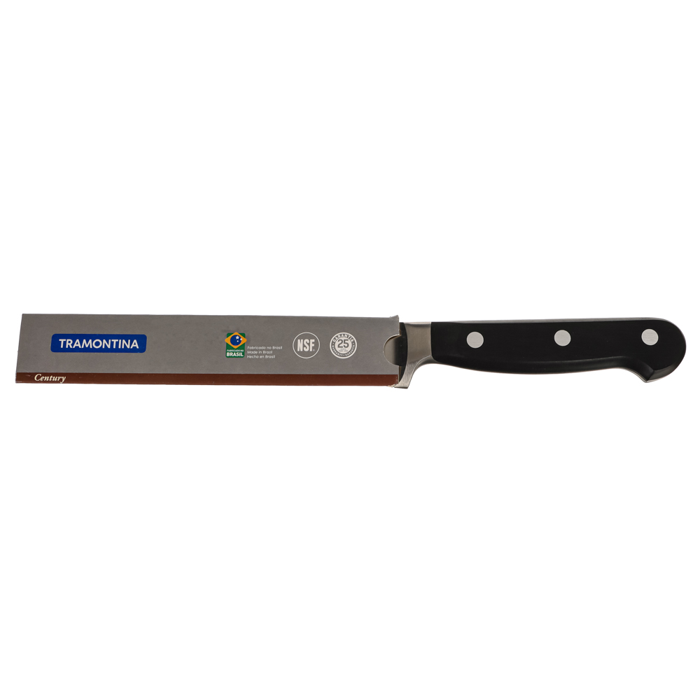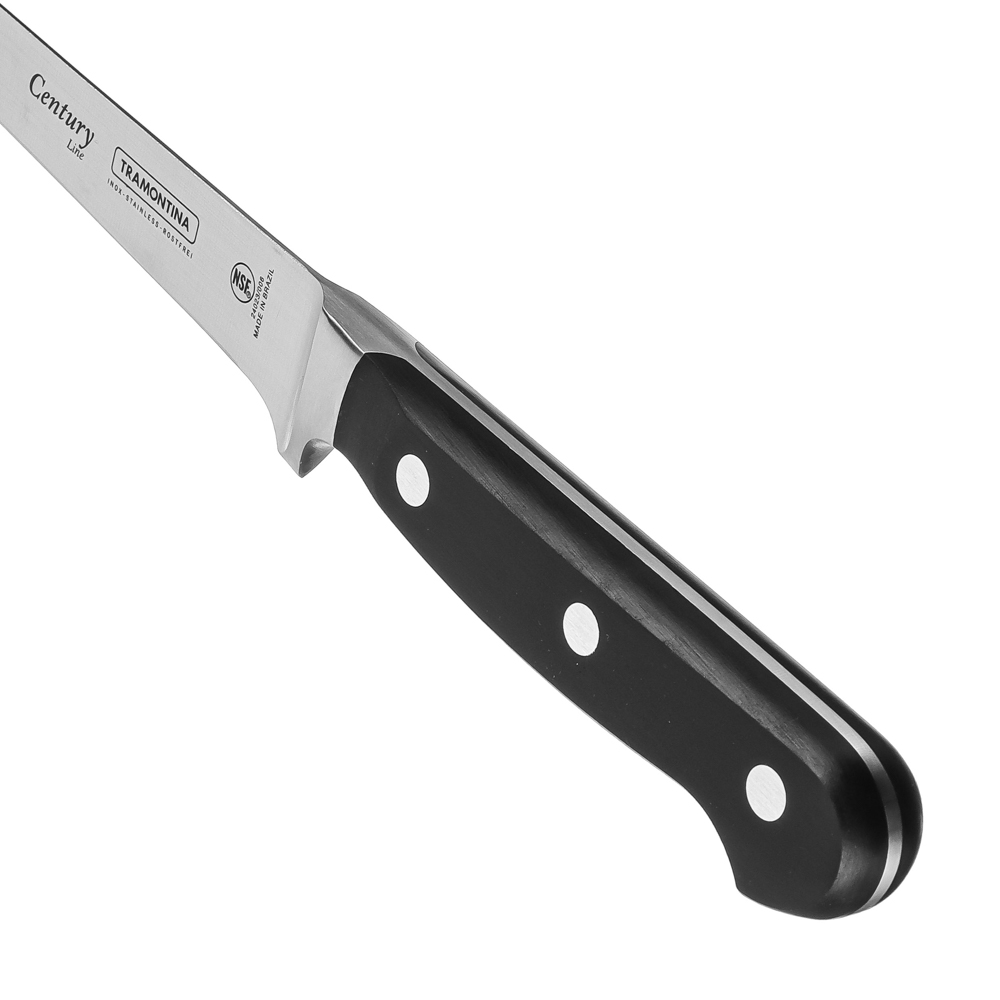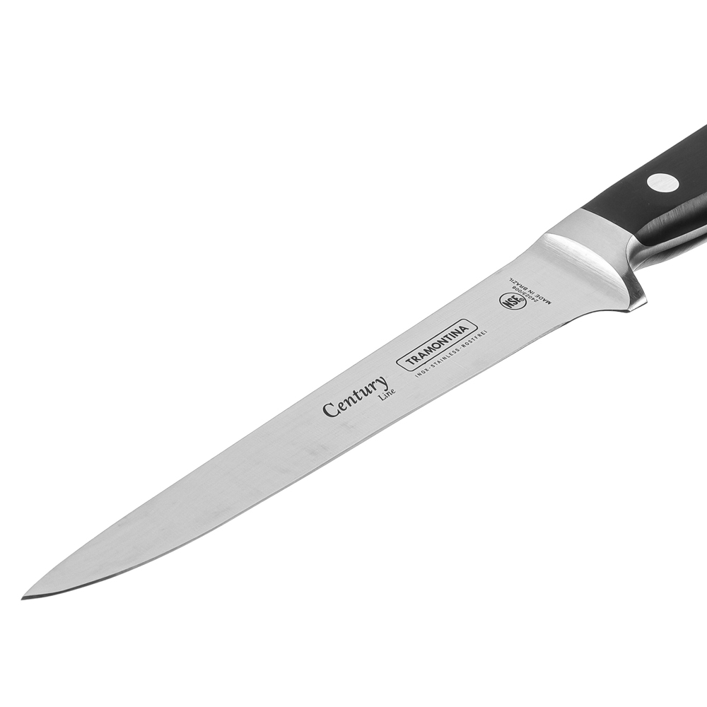 Гибкий филейный нож Tramontina Century помогает получить филе из курицы, рыбы и мяса. Тонко нарезает рыбу для суши. Позволяет получить ровные красивые ломтики ветчины, сыра и колбасы для сервировки закусок. Рукоятка и лезвие являются цельнолитой конструкций, так что ручка не отпадет в самый неподходящий момент.6 причин купить гибкие филейные ножи Tramontina Century:• твердость 55/58 HRC — всего 10 единиц отделяет от твердости алмаза• высокоуглеродистая сталь 1.4110 KRUPP в разы превосходит сталь AISI 420• поликарбонатная рукоять укреплена стекловолокном• «ковка в штампах» — улучшает структуру металла, но при этом снижает стоимость ножа• V-образное лезвие для идеального разреза• долго остается острым, не тускнеет.