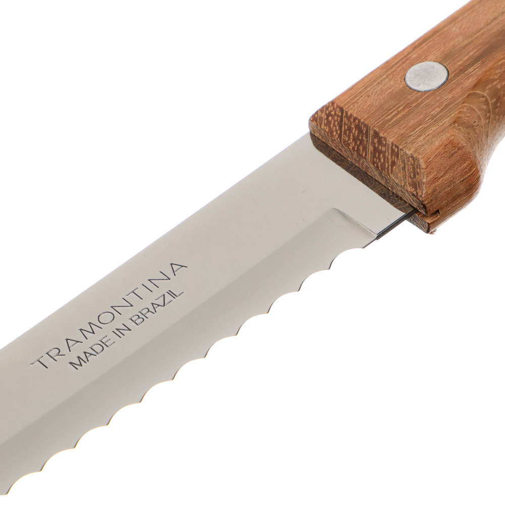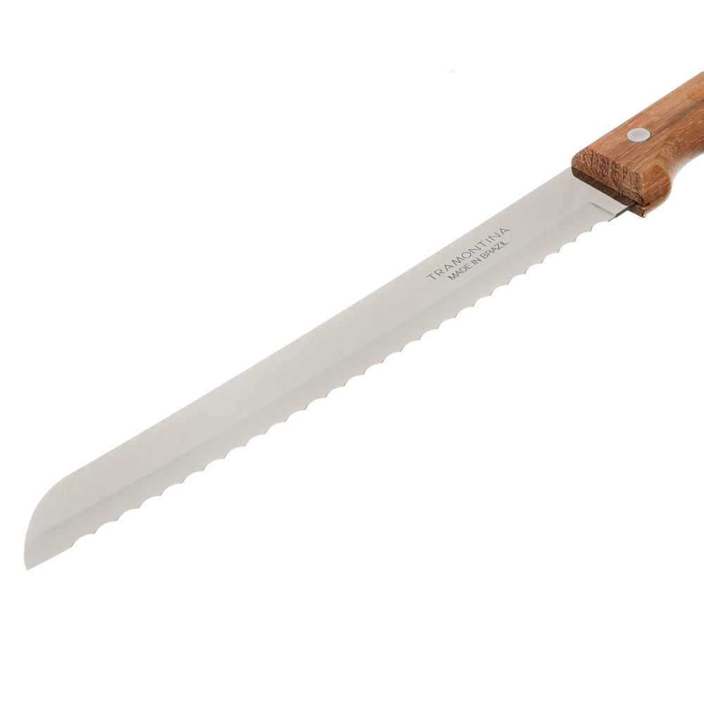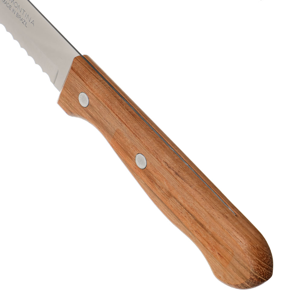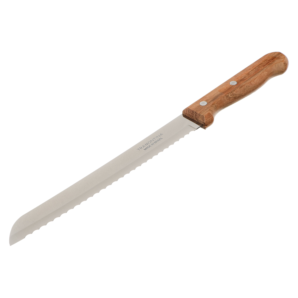 Классический нож Tramontina Dynamic для хлеба с крупной пилообразной режущей кромкой. Прекрасно справляется с твёрдой корочкой свежеиспеченного хлеба. Изготовлен из качественной нержавеющей стали, имеет рукоять из натуральной древесины, которая является очень прочной.