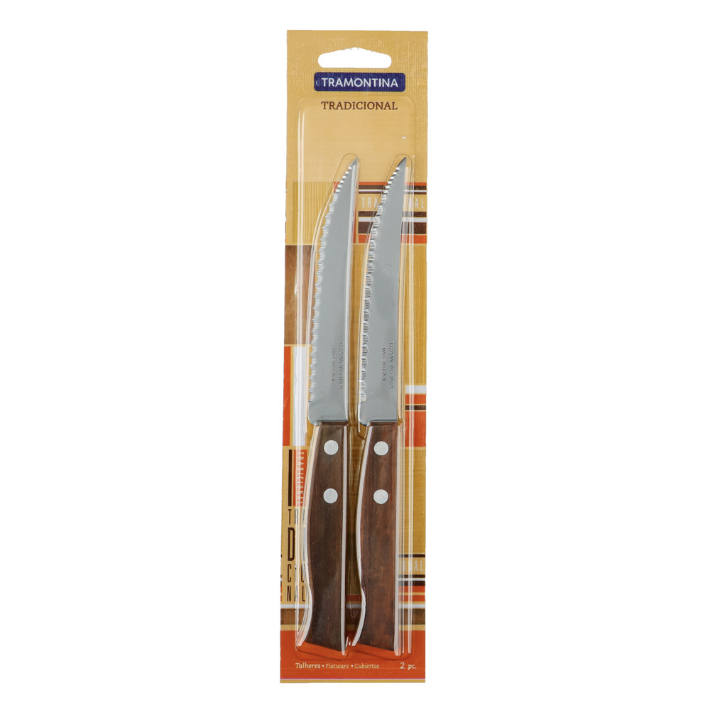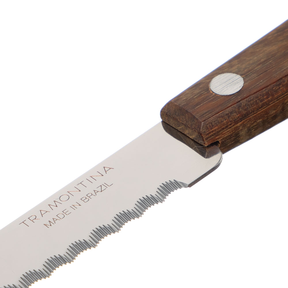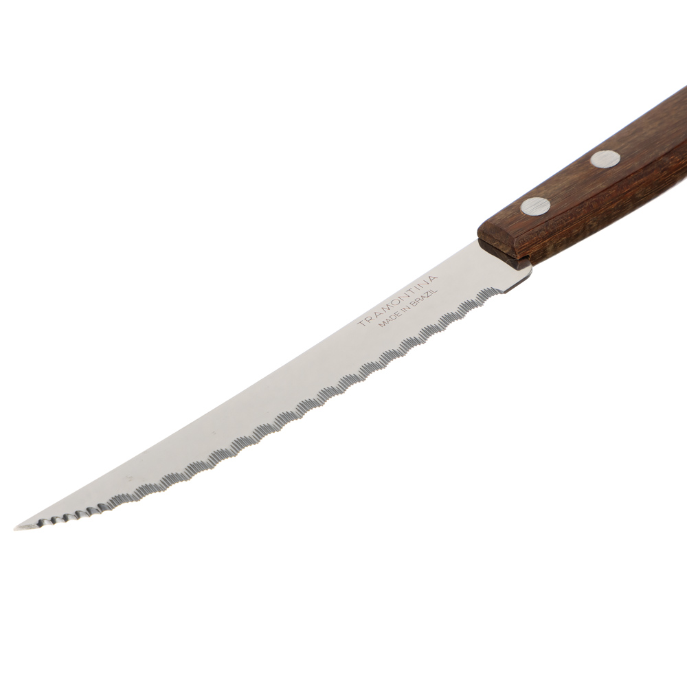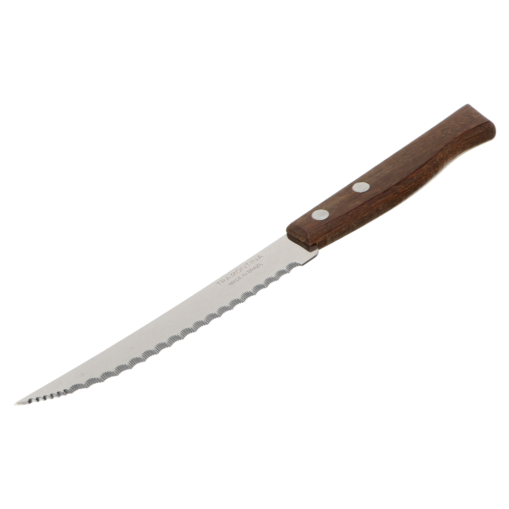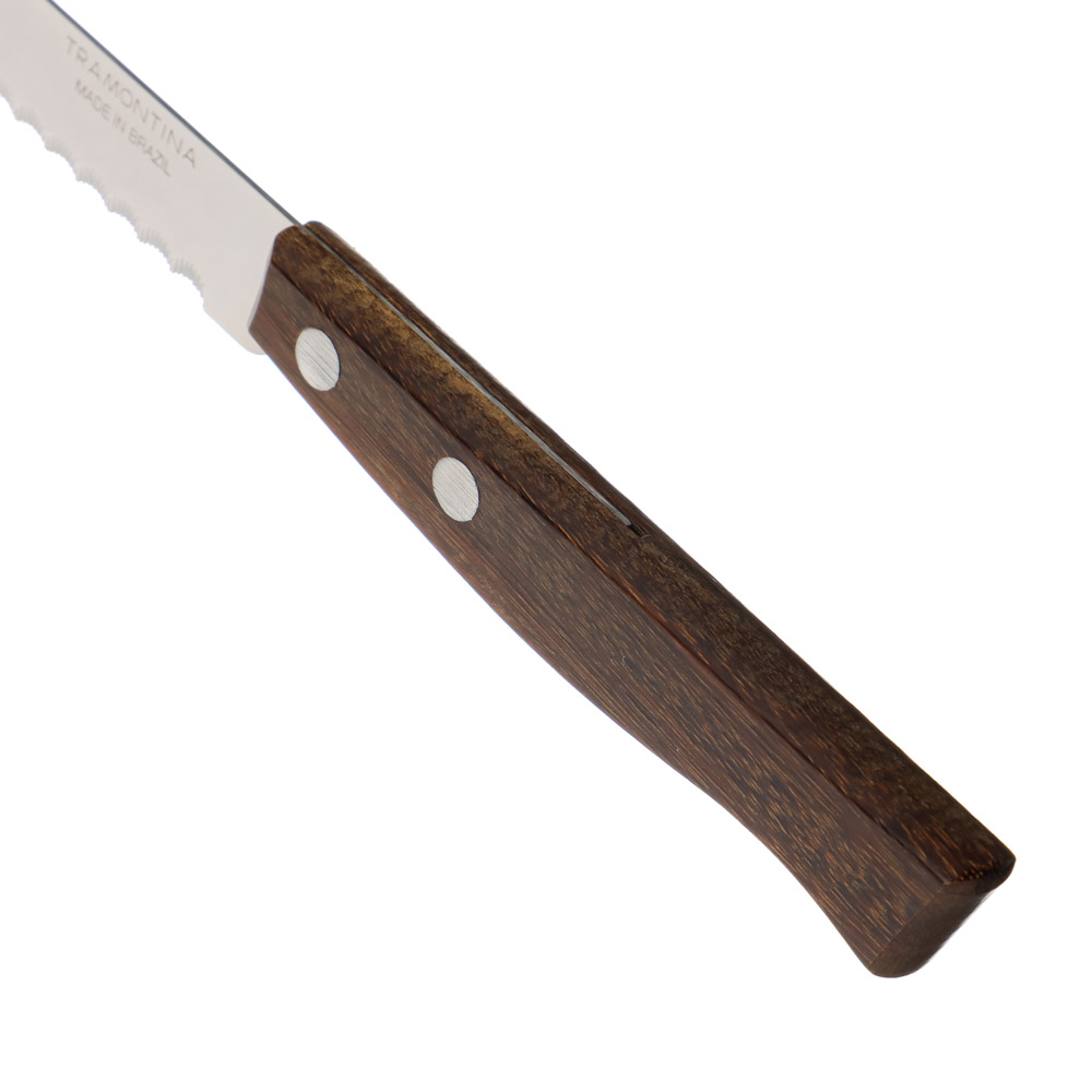 Нож кухонный с зубцами Tramontina Tradicional создан из долговечной антикоррозийной стали. Изготовление лезвия происходит при помощи уникальной ковки, это позволяет ножу оставаться острым значительно дольше. Рукоять выполнена из спрессованных особым методом нескольких деревянных листов. В результате водонепроницаемая рукоять сочетает в себе натуральность дерева и гигиеничность пластика.