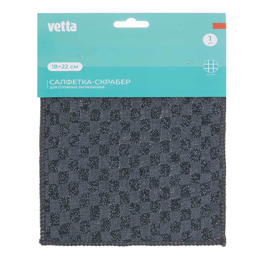 Салфетка скрабер для уборки сложных загрязнений VETTA 18х22 см имеет особую фактуру в клетку, которая сочетает в себе абразивные участки и махровую микрофибру. Позволяет эффективно удалять налипшие загрязнения, а также жир и нагар. Не рвется и не протирается даже при интенсивном использовании. Легко отстирывается. Не накапливает неприятные запахи.