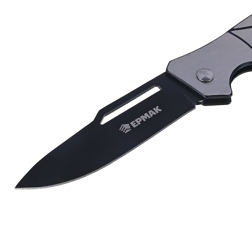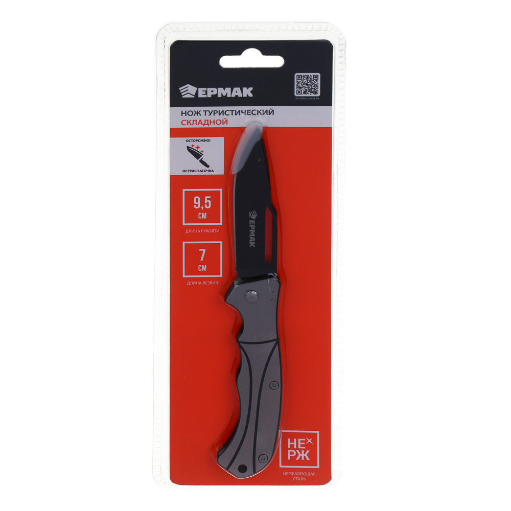 Складной туристический нож ЕРМАК - его берут в походы, поездки, на пикники. Подходит, чтобы нарезать продукты, затачивать деревянные колья, разрезать веревки. Клинок толщиной 1,8 мм - прочный, можно резать твердые предметы. Сделан из нержавеющей стали, не боится воды. Длина клинка 7 см - чуть меньше ладони. Купите для себя или в подарок!