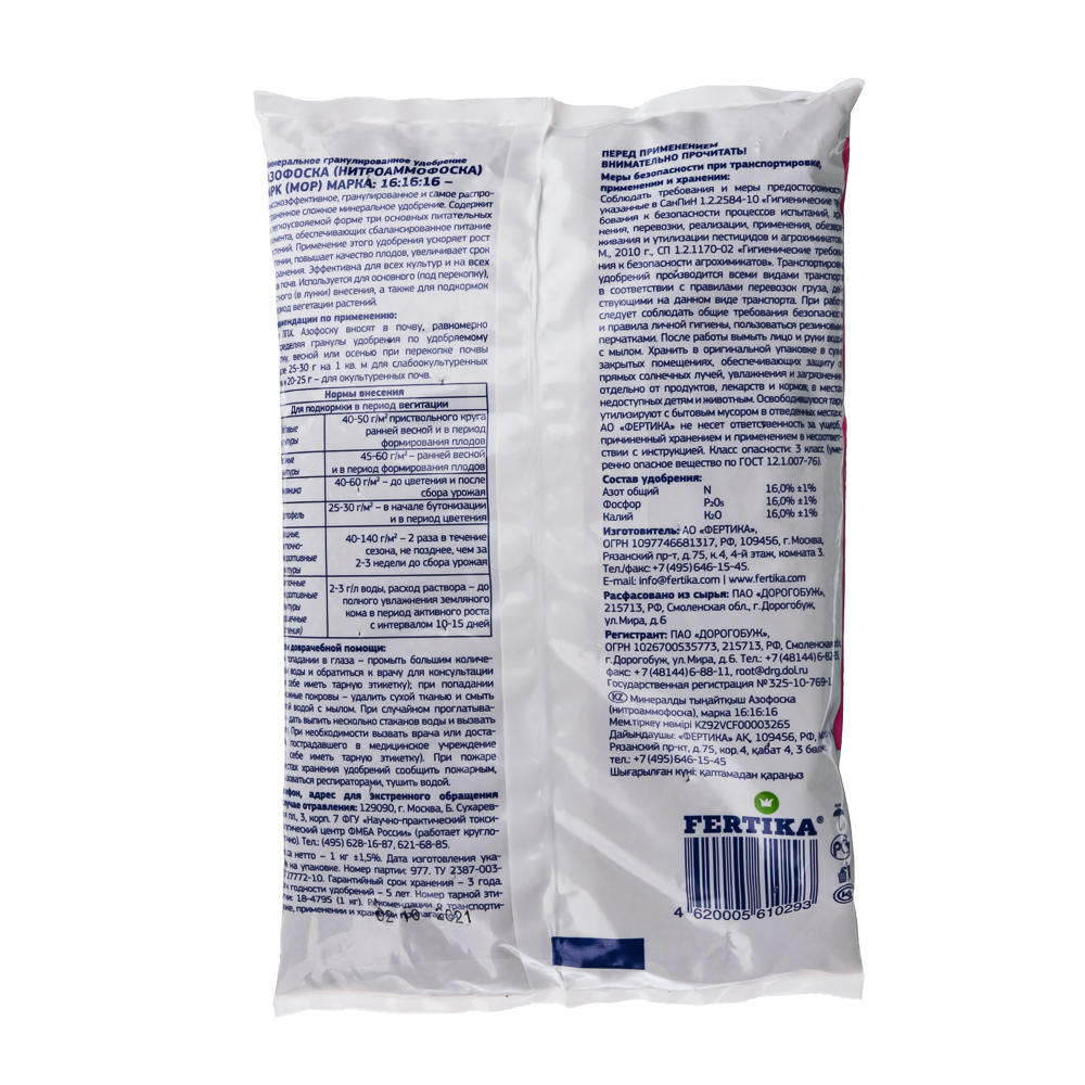 Высокоэффективное сбалансированное универсальное минеральное азотно-фосфорно-калийное удобрение «Азофоска» предназначено для подкормки всех видов сельскохозяйственных групп растений. В состав входят три основных элемента питания растений в оптимальной для них пропорции. Эффективно для всех культур и на всех типах почв. Способствует ускорению созревания и повышению урожайности, повышает качество плодов, увеличивает срок их хранения. Используется для основного (при перекапывании почвы весной или осенью), местного (в рядки, борозды или лунки) внесения, а также для подкормок в период вегетации растений. Состав: массовая доля питательных веществ, мас. %, не менее: азот (N) – 16%, фосфор (Р2О5) – 16%, калий (К2О) – 16%.