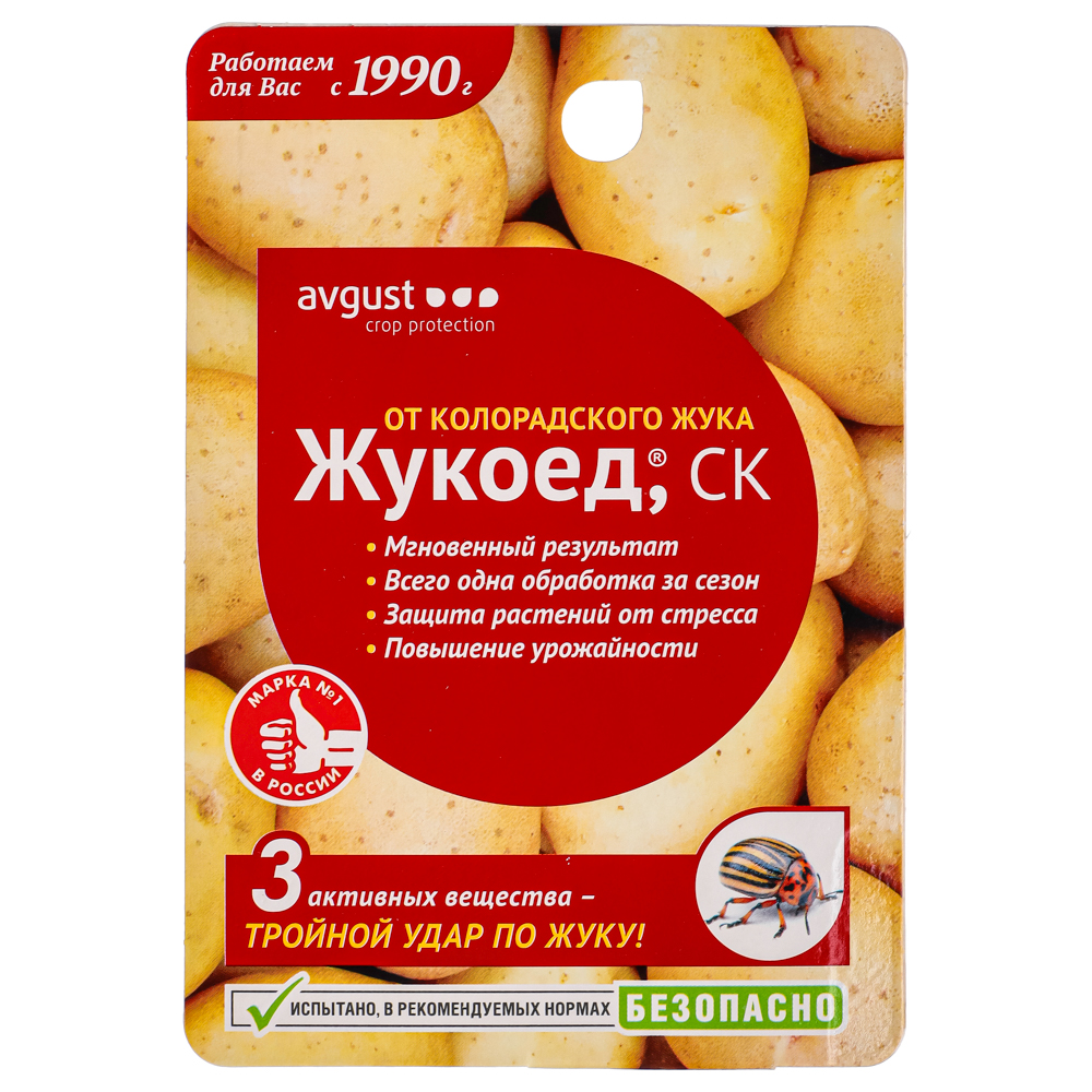 Новое решение в борьбе с колорадским жуком! Жукоед — инновационный препарат от колорадского жука на картофеле, в состав которого входят три активных действующих вещества, принадлежащие к разным классам химических соединений, отличающихся по механизму действия и физическим свойствам:1. Альфа-циперметрин (оказывает контактное действие, концентрируется на поверхности растений и характеризуется мгновенным действием — «нокдаун—эффект»: вредители прекращают питаться в течение 1 часа после опрыскивания и погибают);2. Имидаклоприд (обладает системным действием, быстро поглощается листьями, лишая колорадского жука возможности нанести культуре серьезные повреждения, активно перераспределяется по картофелю, поддерживая постоянную эффективную защиту всех его частей. За счет антистрессовых свойств повышает способность растения противостоять неблагоприятным природным условиям, увеличивает урожайность);3. Клотианидин (медленно распределяется и надежно закрепляется во всех тканях растения, обесп