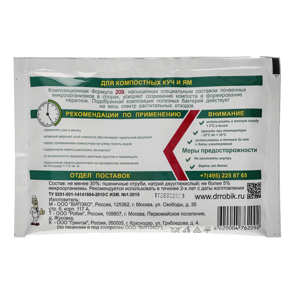 Биоактиватор ускоритель компоста Доктор Робик — регулярное применение раз в месяц позволит получать обогащенный питательными веществами компост в короткие сроки. В результате распада получается сбалансированный компост, который является прекрасным средством для подкормки и пересадки растений. Простой в использовании Доктор Робик не содержит едких веществ, безвреден для окружающей среды.Рекомендации по применению:- Применять раз в месяц.- Перед использованием компостную яму/кучу полить водой.- Содержимое пакета рассыпать на компост.- По возможности присыпать местным грунтом и перемешать.- Влажный верхний слой компоста гарантирует идеальный результат.- Содержимое пакета рассчитано на однократное применение на площади 1-1,5 м2.