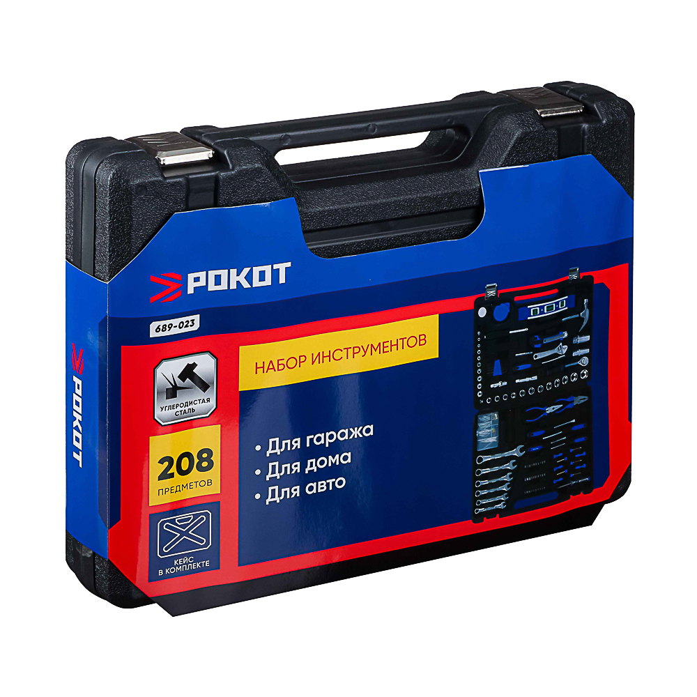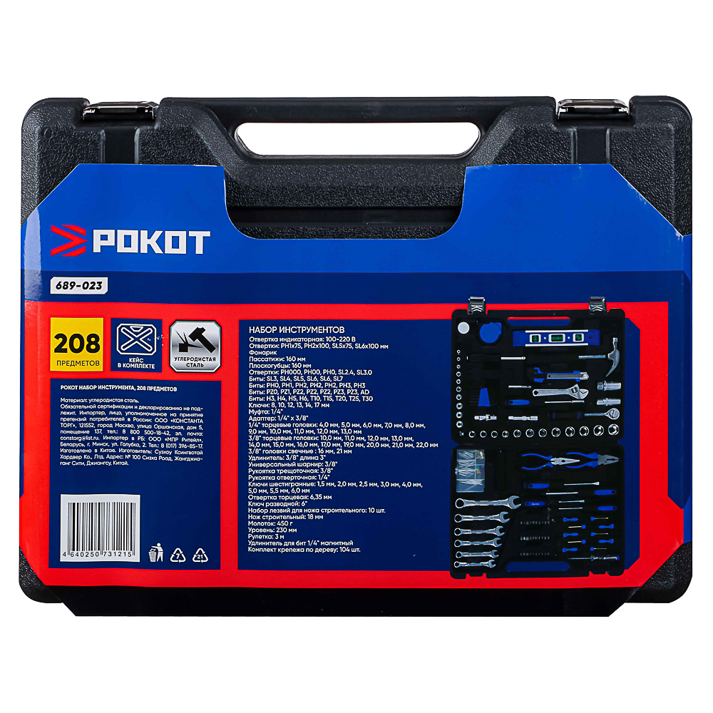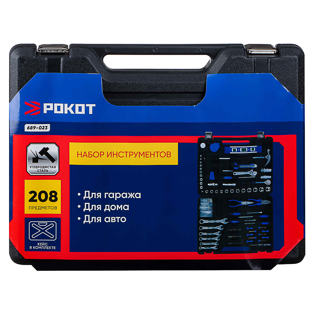 Набор инструмента РОКОТ из 208 предметов – это расширенный комплект инструментов для сервиса, ремонта, обслуживания и проведения монтажных работ. Незаменим для дома, гаража и автомастерской. В наборе содержатся: отвертки с разными типами шлицев, индикаторная и трещоточная отвертки, фонарик, пассатижи, биты, ключи в том числе шестигранные, муфта, адаптер, торцевые и свечные головки, удлинитель, универсальный шарнир, отверточная и трещоточная рукоятки, разводной ключ, нож строительный с набором лезвий, а также молоток, уровень, рулетка и комплект крепежа для дерева 104 шт. Инструменты из углеродистой стали рассчитаны на долгие годы эксплуатации, устойчивы к истиранию, имеют оптимальную твердость, не ломаются. Пластиковый кейс обеспечит компактное хранение и удобство транспортировки.