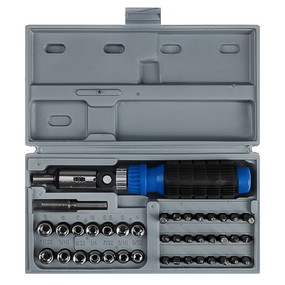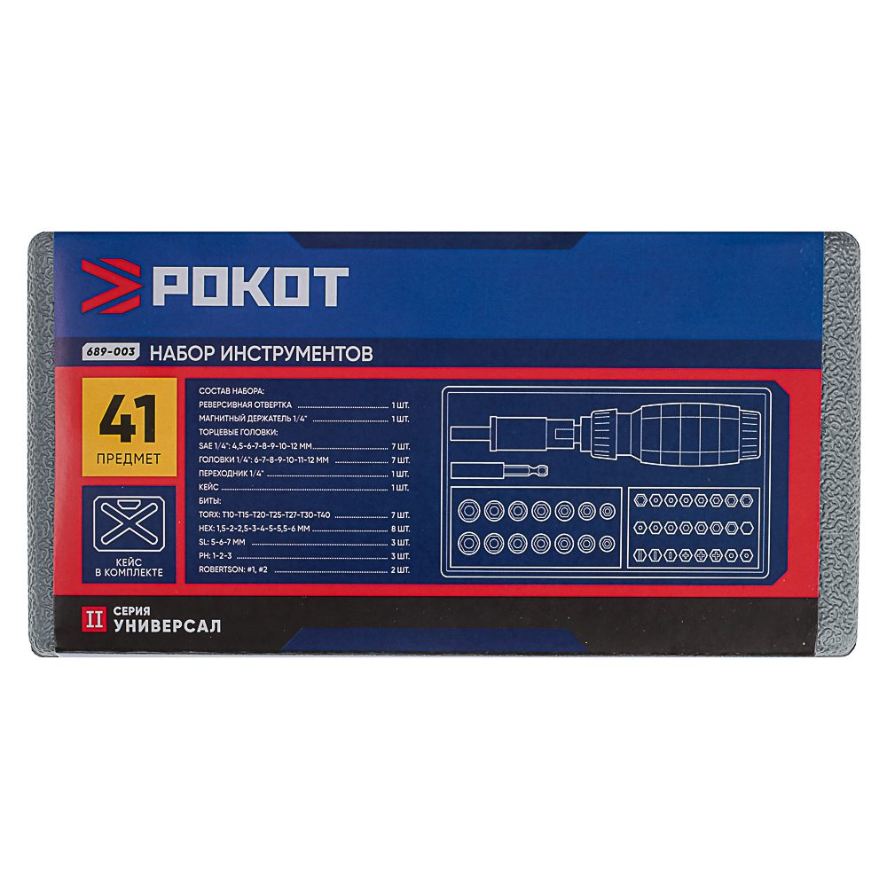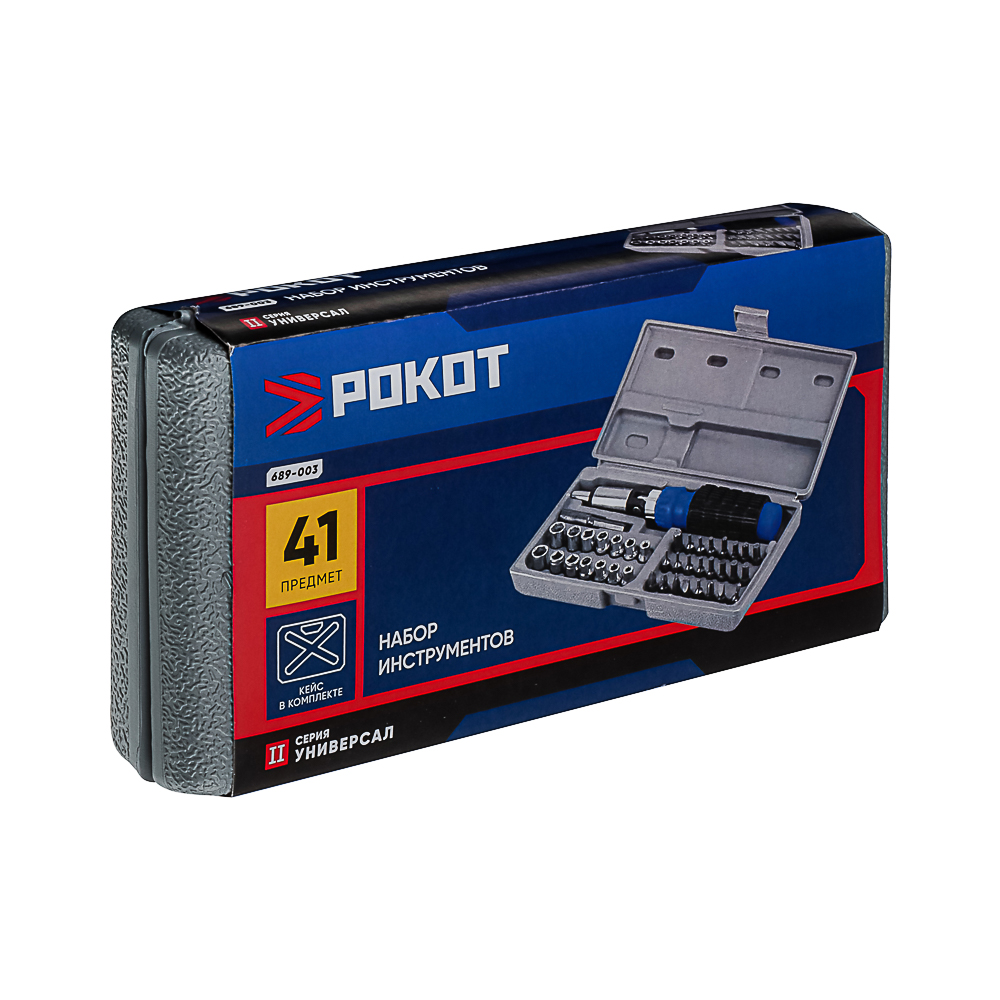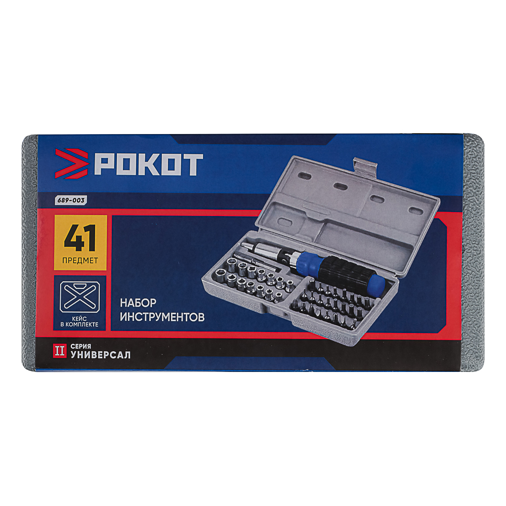 Набор инструментов Рокот - реверсивная отвертка, магнитный держатель, торцевые головки и биты разного размера. В наборе 41 предмет. Подходит для домашнего использования - например, чтобы ремонтировать бытовую технику или собирать мебель. Рукоятка отвертки пластиковая с насечками - не скользит в руке. Набор в пластиковом пенале - все биты и головки всегда под рукой. Размеры головок и бит на упаковке. Набор не подходит для работ с высокой нагрузкой - например, чтобы ввинчивать саморезы по дереву без подготовленных отверстий. Для таких случаев используйте отвертки повышенной прочности или шуруповерт.