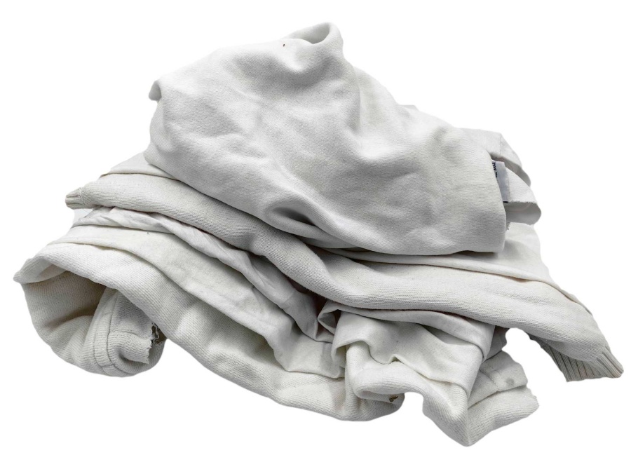 Ветошь "белый трикотаж" - это переработанная одежда second-hand из трикотажных х/б тканей белого цвета, доускается до 5% включений другого цвета: майки, футболки, водолазки, постельное трикотажное белье и др. Куски неправильной формы размером, примерно, 40х60 см. Количество лоскутов в одном брикете - 100-120 шт.