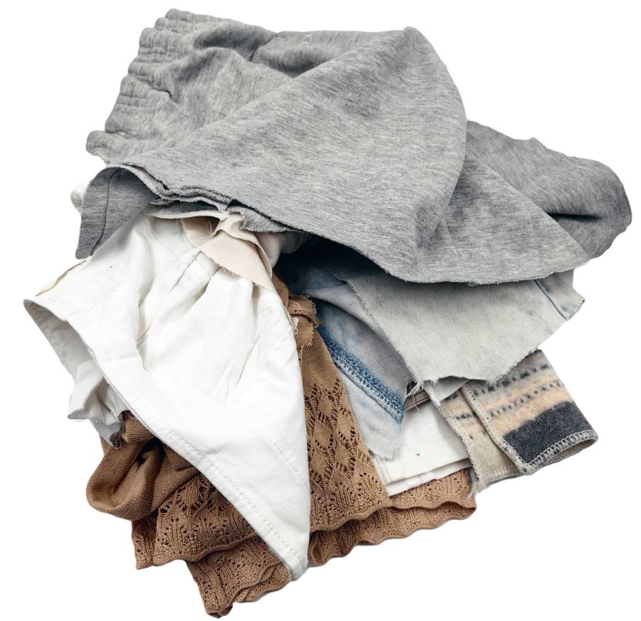 Состав брикета: переработанная одежда светлых оттенков (second-hand). Включает в себя плотные трикотажные изделия, светлую джинсу, рабочую одежду из смесовых тканей. Материал обладает высокой прочностью на разрыв.