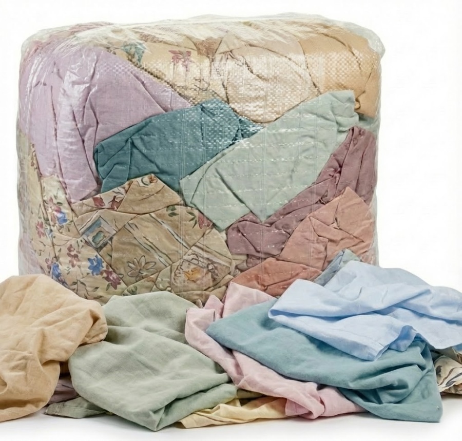 Изготавливается из переработанного постельного белья (second-hand). В состав брикета входят только натуральные хлопчатобумажные ткани: бязь, сатин, ситец.