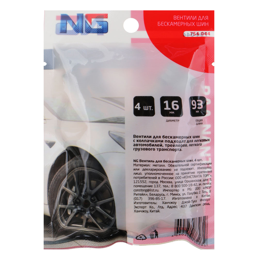 Вентиль для бескамерных шин NG – это набор из 4-х металлических вентилей универсального размера диаметром 16 мм и общей длиной 93 мм. Вентили прочные, долговечные, устойчивы к коррозии. Герметичные, не пропускают воздух из шины, что гарантирует стабильное давление воздуха после накачки. Предназначены для использования в бескамерных шинах легковых автомобилей, трейлеров и легкого грузового транспорта.