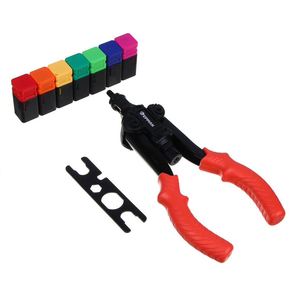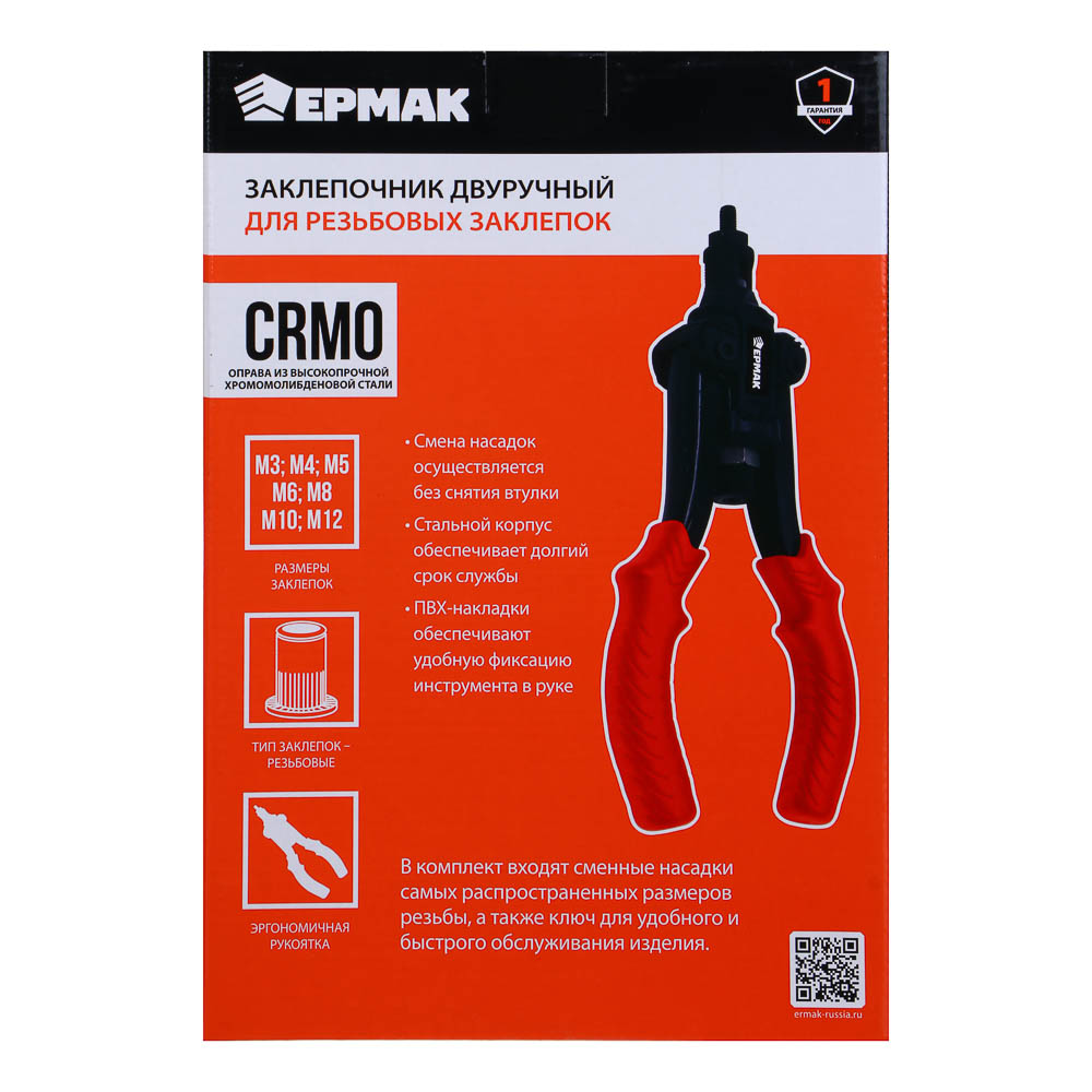 Заклепочник двуручный ЕРМАК предназначен для установки резьбовых заклепок диаметром от М3 до М12, обеспечивая прочное и надёжное соединение деталей без сварки. Двуручная конструкция позволяет приложить оптимальное усилие, обеспечивая удобство и точность работы даже при длительном использовании. Инструмент подходит для работы с металлом, пластиком и другими материалами в бытовых и профессиональных условиях.