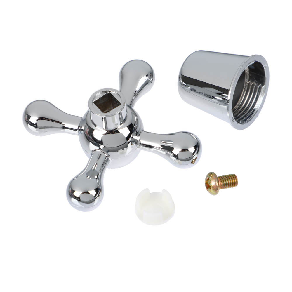 Ручка для смесителя с соединением под квадрат, крестового типа предназначена для кранов и смесителей с вентильным механизмом. Легко и быстро устанавливается на кран-буксу, надежно фиксируется. Изготовлена из пластика, имеет качественное покрытие серебряного цвета, устойчивое к царапинам. Комплект включает 2 заглушки с маркировкой «hot» и «cold» для горячей или холодной воды соответственно.