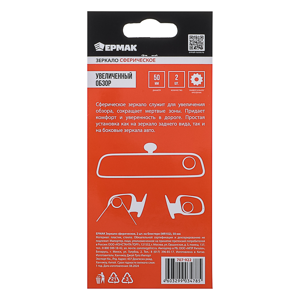 Сферическое зеркало ЕРМАК предназначено для повышения безопасности при вождении и контроля за слепыми зонами автомобиля. Комплект из двух зеркал позволяет установить их на боковые зеркала заднего вида, обеспечивая широкий угол обзора и улучшая видимость прилегающих участков дороги. Зеркала имеют диаметр 50 мм и компактный размер, что позволяет легко разместить их на зеркалах любого типа без нарушения обзора водителя. Благодаря сферической форме отражение охватывает больше пространства, что особенно полезно при перестроениях, парковке и маневрировании в условиях ограниченной видимости.